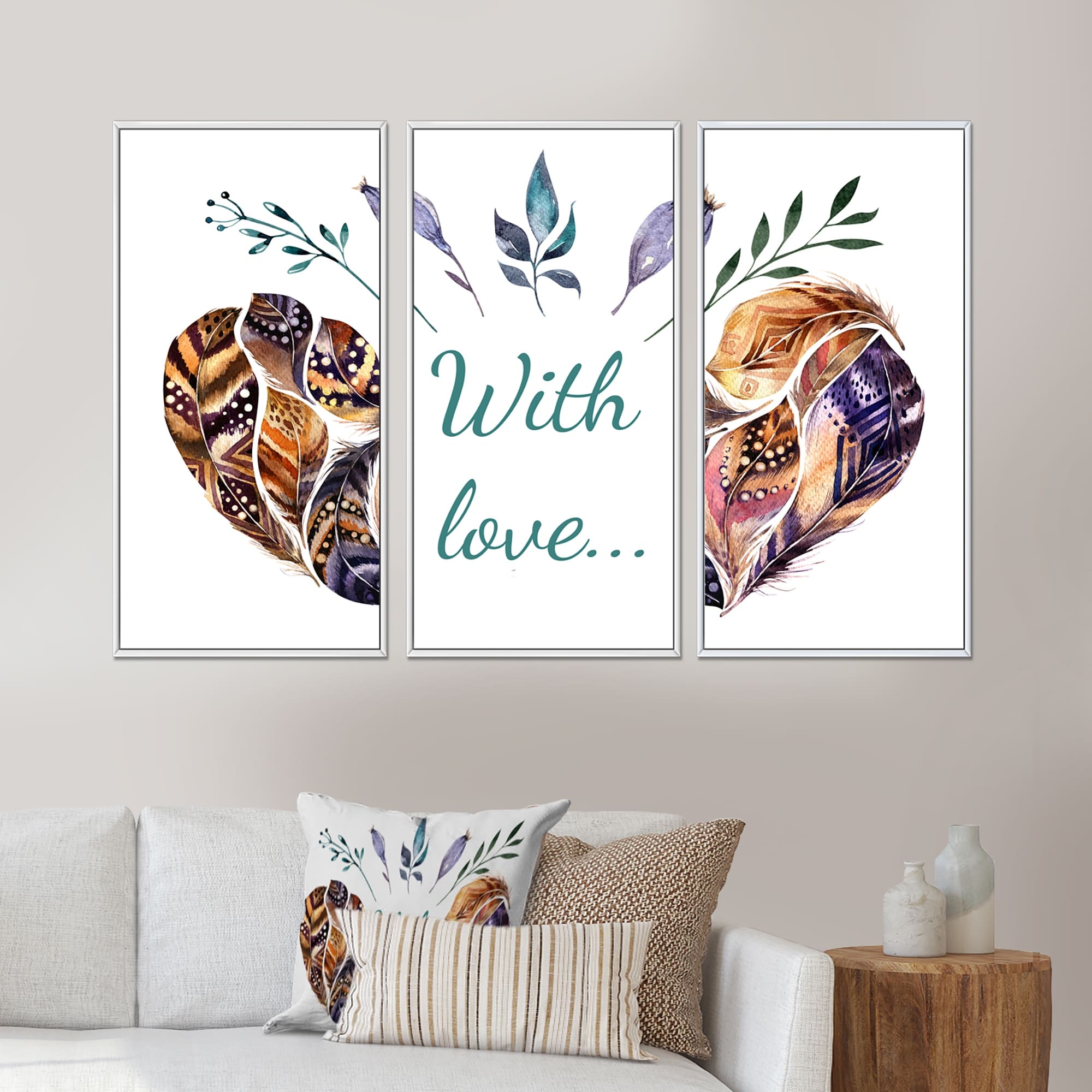 Designart "Hearted Shaped Valentine Feathers" Traditional Framed Art Set of 3 - 4 Colors of Frames