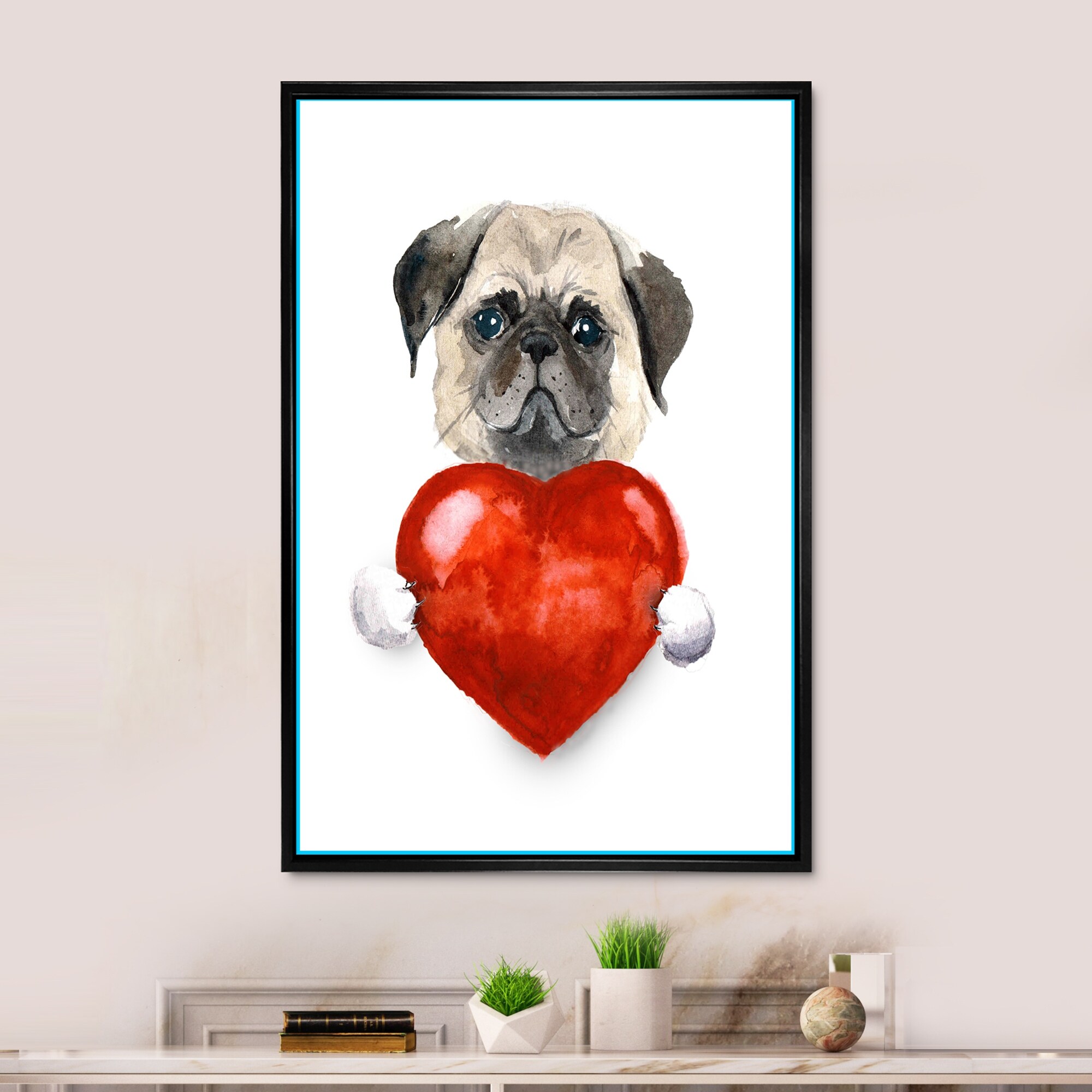 Designart "Little Dog Holding Valentine Heart" Children's Art Framed Canvas Wall Decor