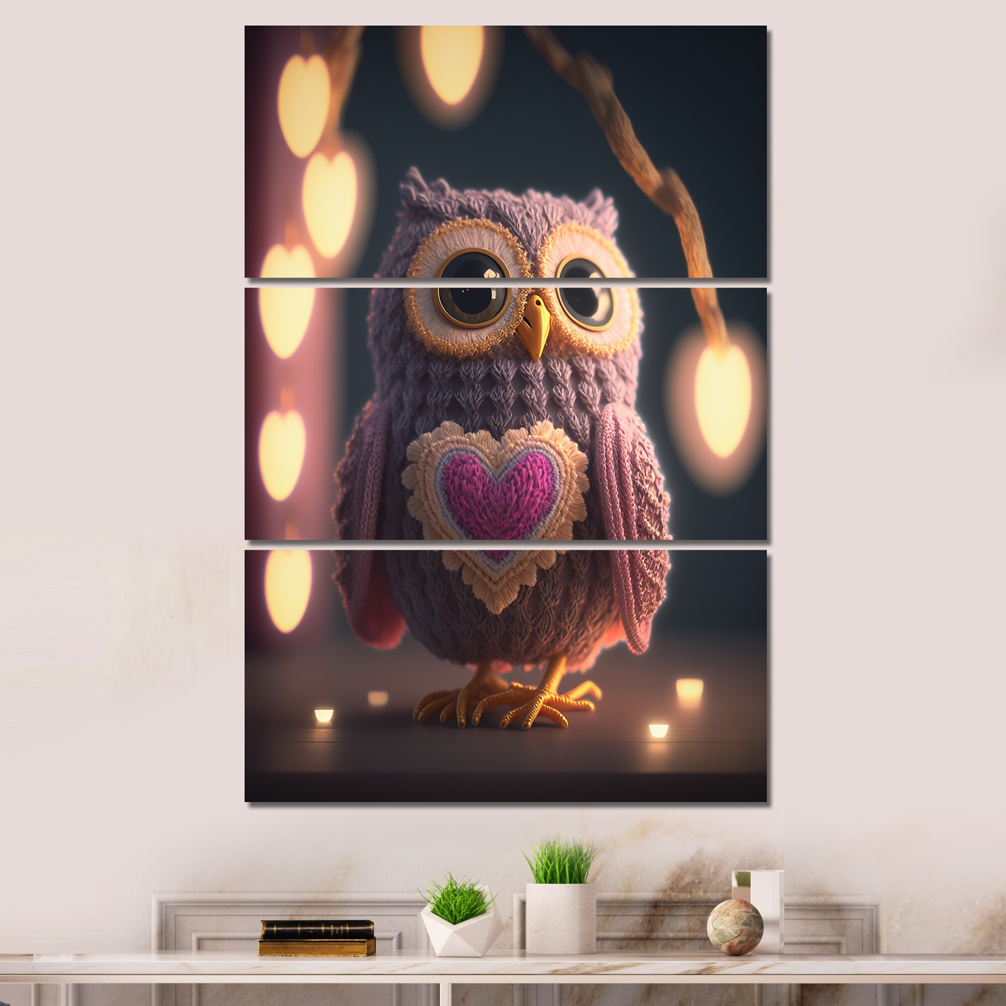 Designart "Cute Knitted Valentine Heart Owl I" Animals Owl Canvas Art Print - 3 Panels