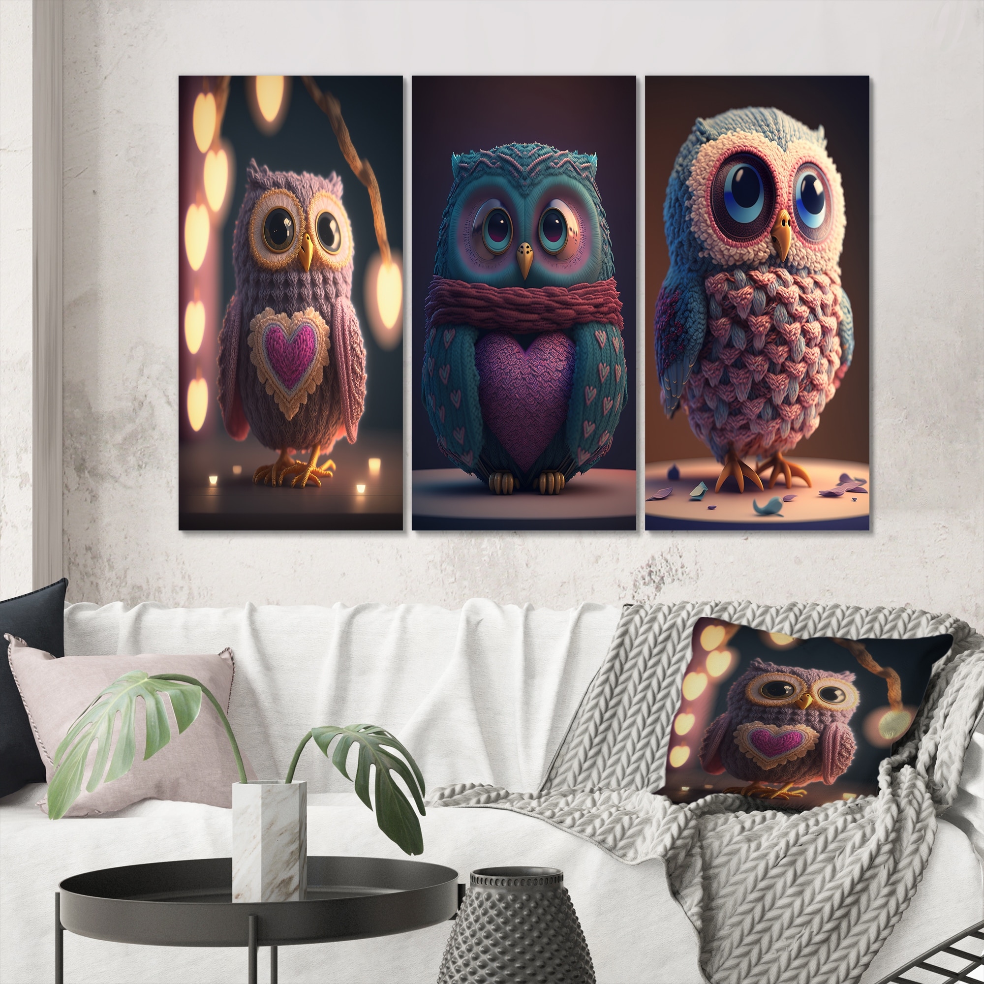 Designart "Cute Knitted Valentine Heart Owl I" Animals Owl Canvas Prints Set of 3 Pieces
