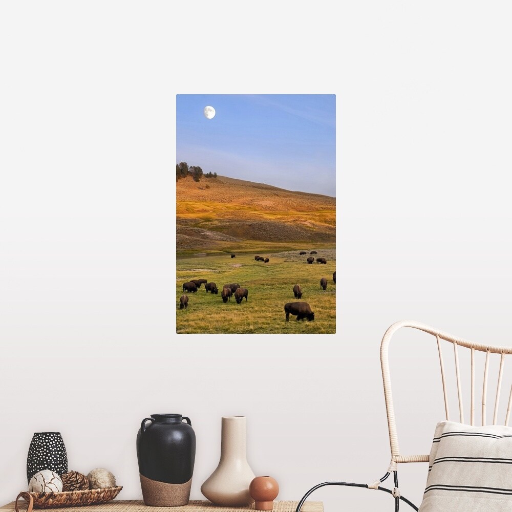 "Bison grazing on hill at Hayden Valley, Moonrise, Yellowstone National Park, WY." Poster Print - Multi