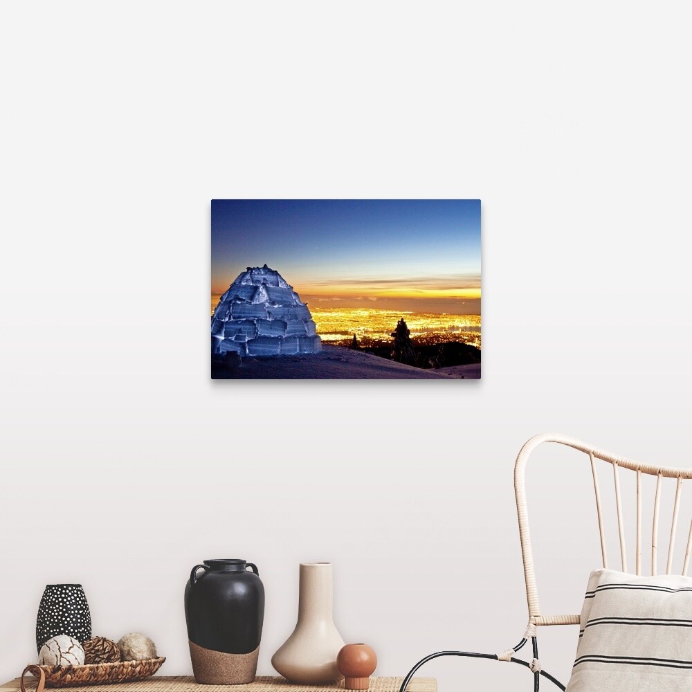 "Igloo illuminated on Seymour Mountain at sunset near city lights of Vancouver" Canvas Wall Art