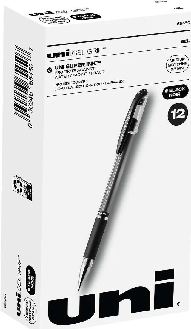 uni-ball Signo GRIP Stick Gel Pen 0.7mm Black Ink Silver/Black Barrel Dozen