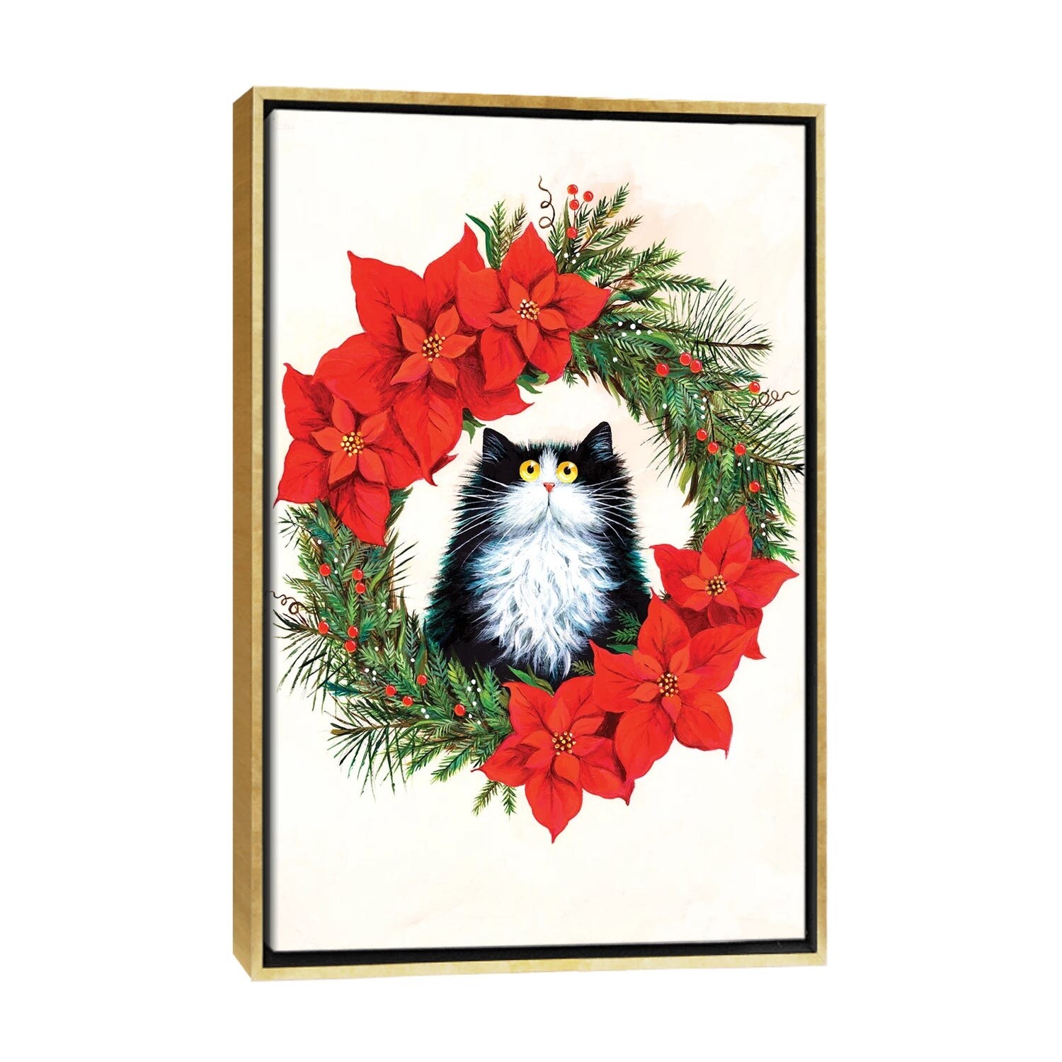 iCanvas "Black And White Cat in Poinsettia Wreath" by Kim Haskins Framed Canvas Print