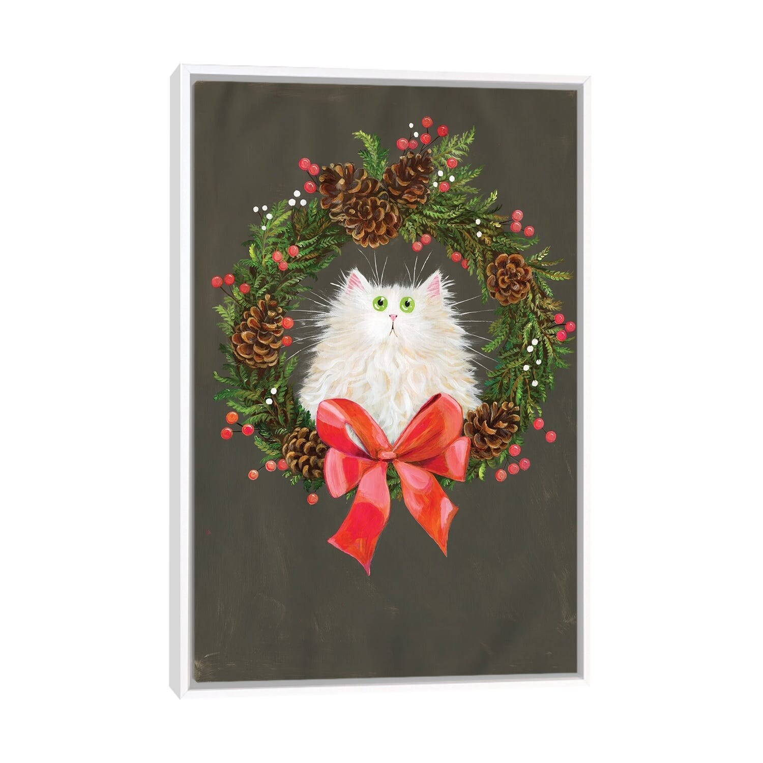 iCanvas "Festive Wreath White Cat" by Kim Haskins Framed Canvas Print