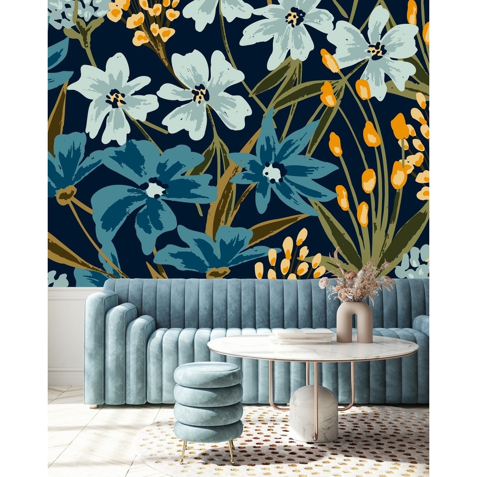 Orange Little Flowers and Blue Flowers Wallpaper Peel and Stick and Prepasted
