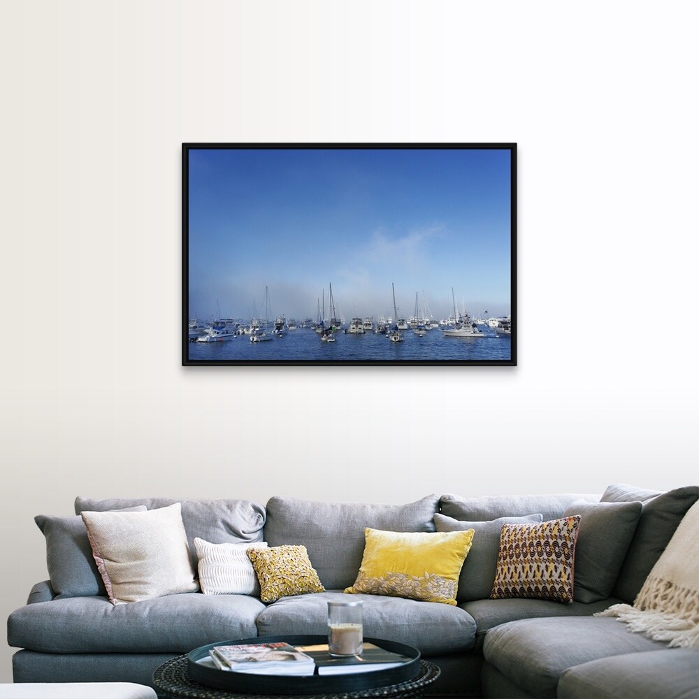 "Boats in mist, Catalina Harbor" Black Float Frame Canvas Art