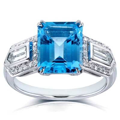 Annello by Kobelli 14k White Gold 4 1/2ct TGW Emerald-cut Blue Topaz and Bullet-cut Diamond Art Deco Ring