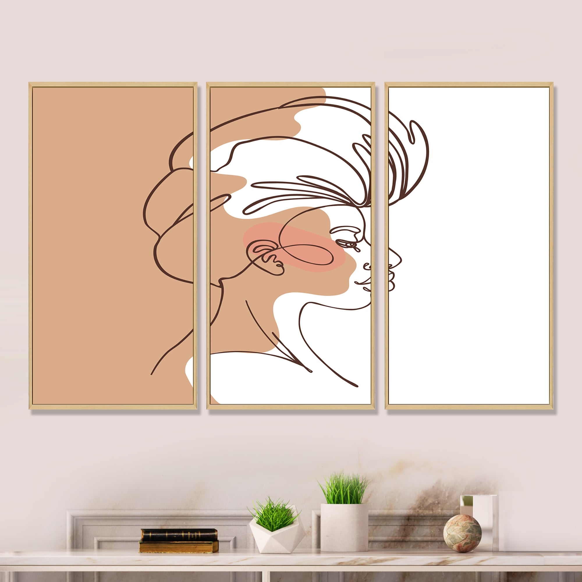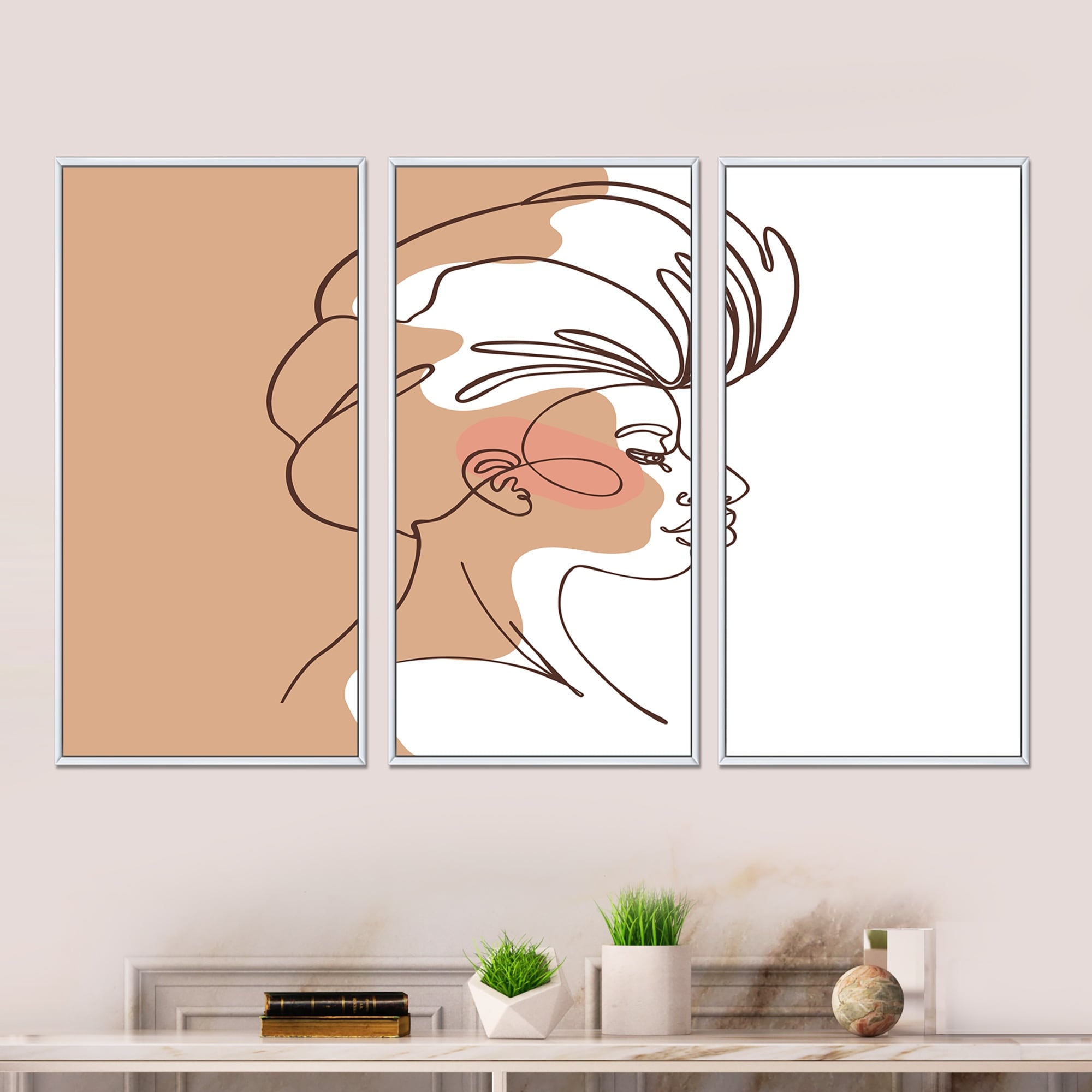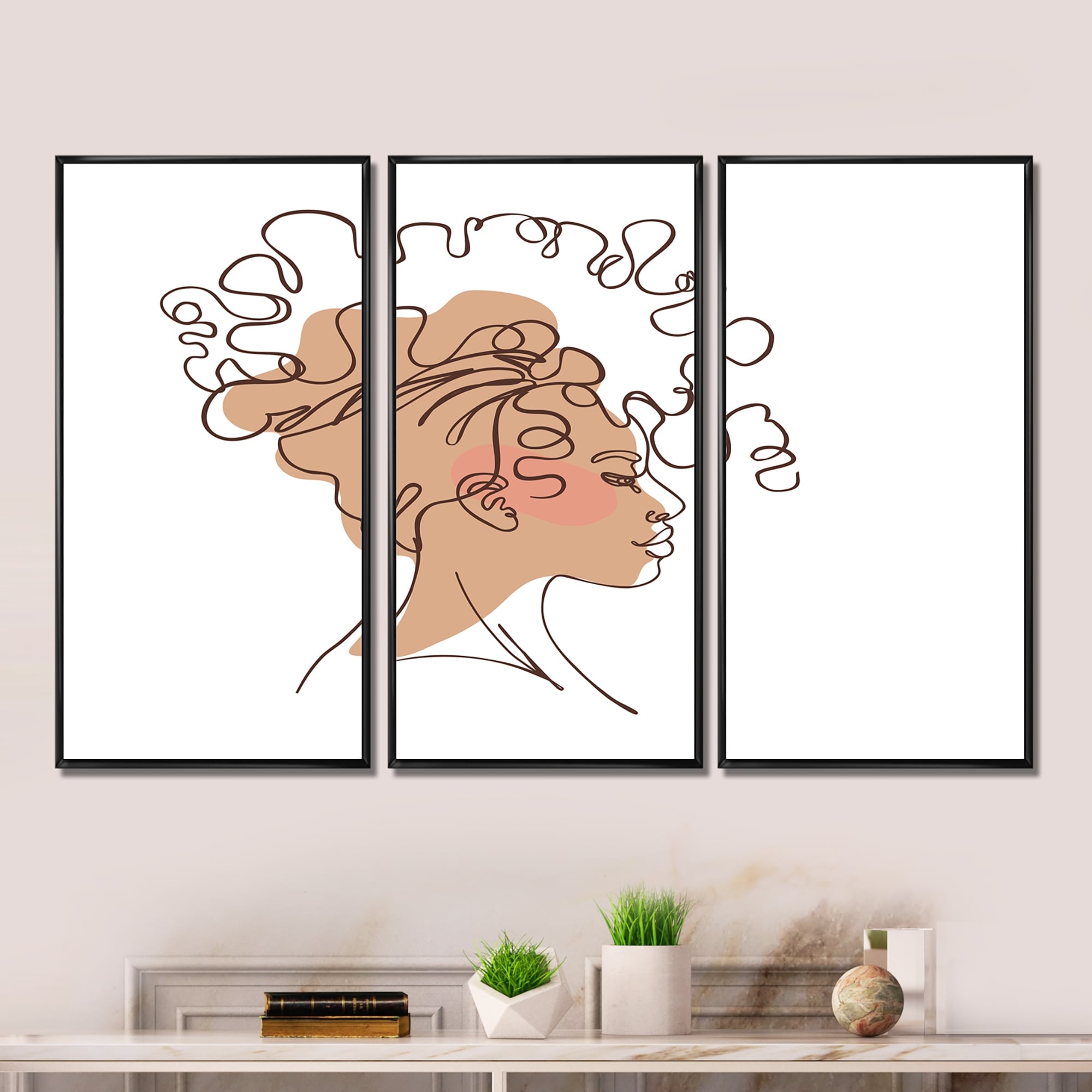 Designart "One Line Art Portrait of Woman in Terracotta Tones" Modern Framed Wall Art Set of 3 - 4 Colors of Frames