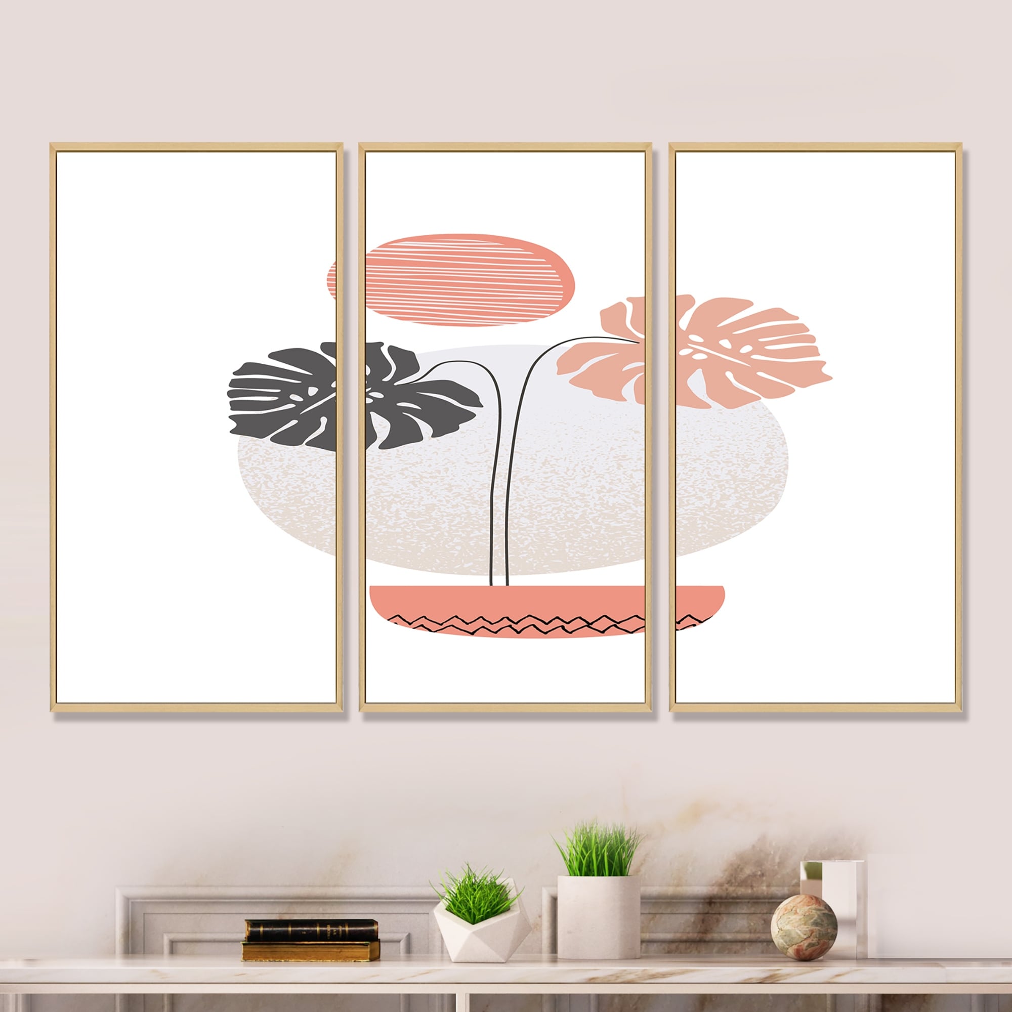 Designart "Abstract One Line Art Tropical Plants I" Tropical Framed Wall Decor Set of 3 - 4 Colors of Frames