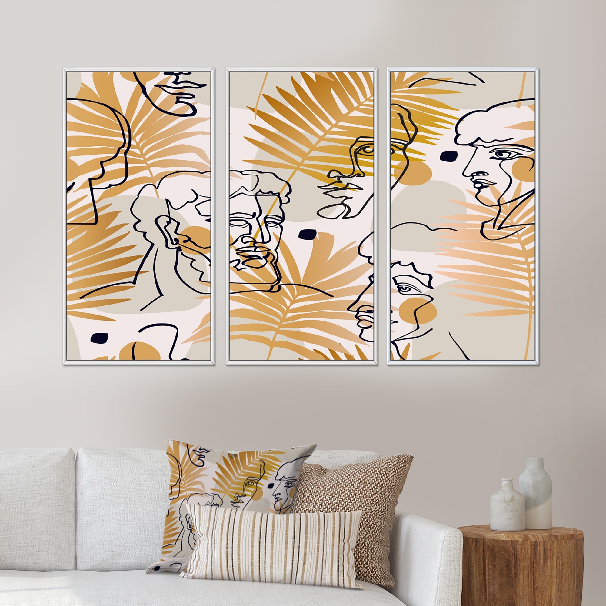 Designart "One Line Art Portrait With Tropical Leaves" Vintage Framed Wall Decor Set of 3 - 4 Colors of Frames