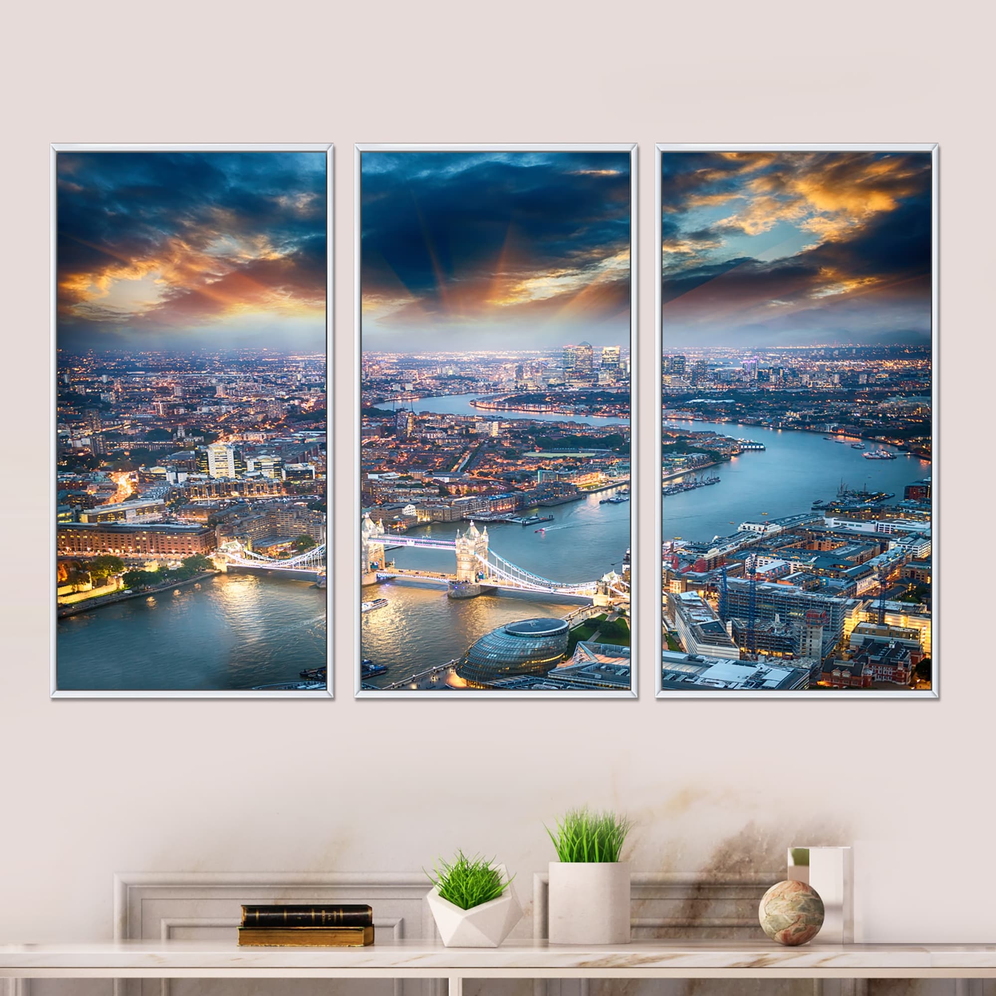 Designart "Aerial View of London at Dusk" Cityscape Framed Canvas Wall Art Set of 3 - 4 Colors of Frames