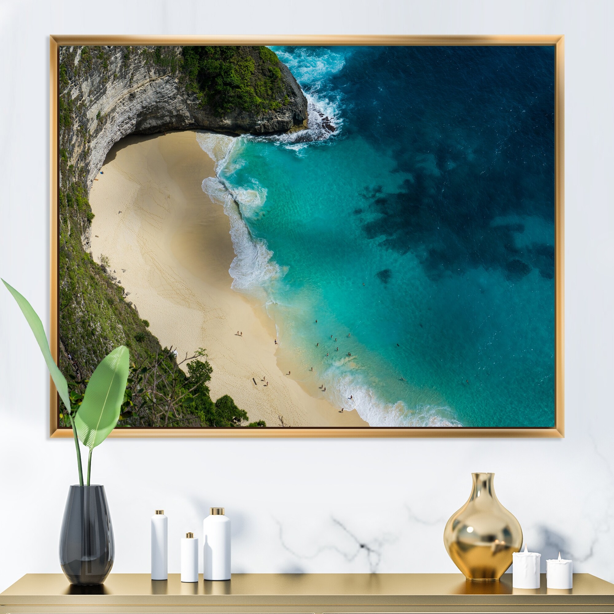 Designart "Aerial View of Idyllic Blue Ocean Beach" Traditional Framed Canvas Wall Art Print