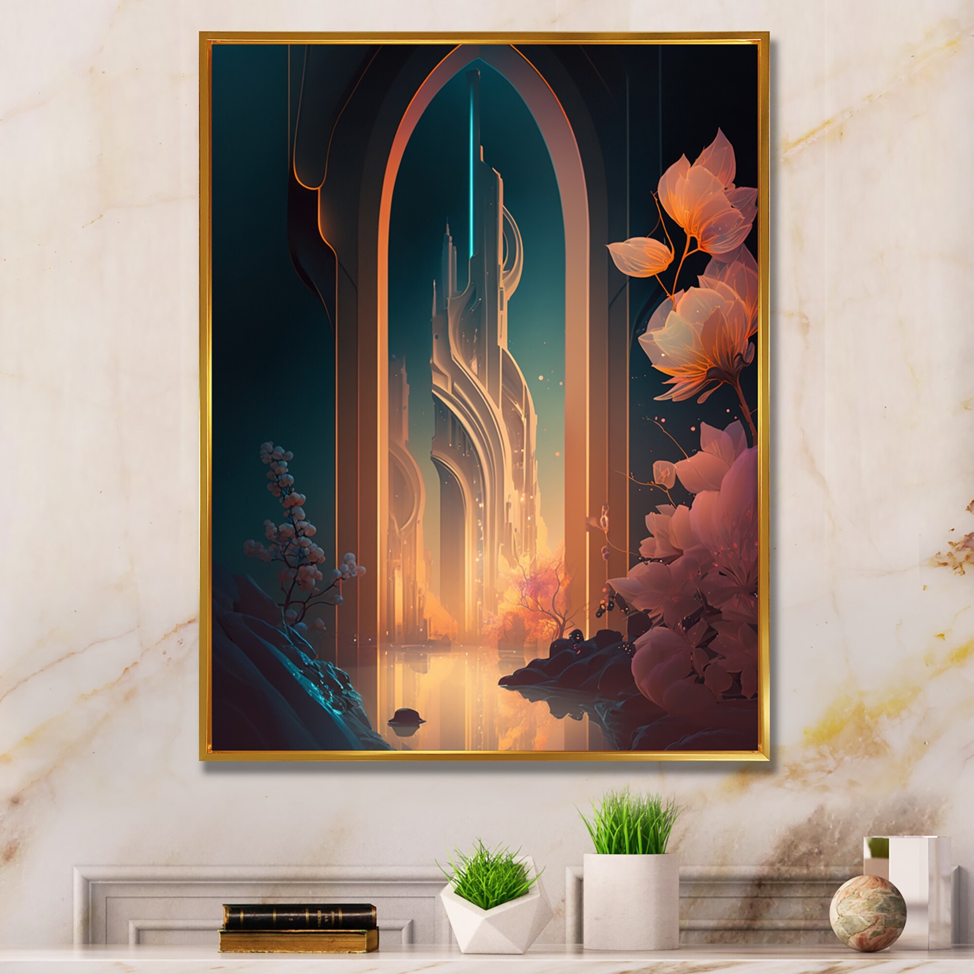 Designart "Futristic Architecture With Flowers II" City Fantasy Framed Canvas Art Print