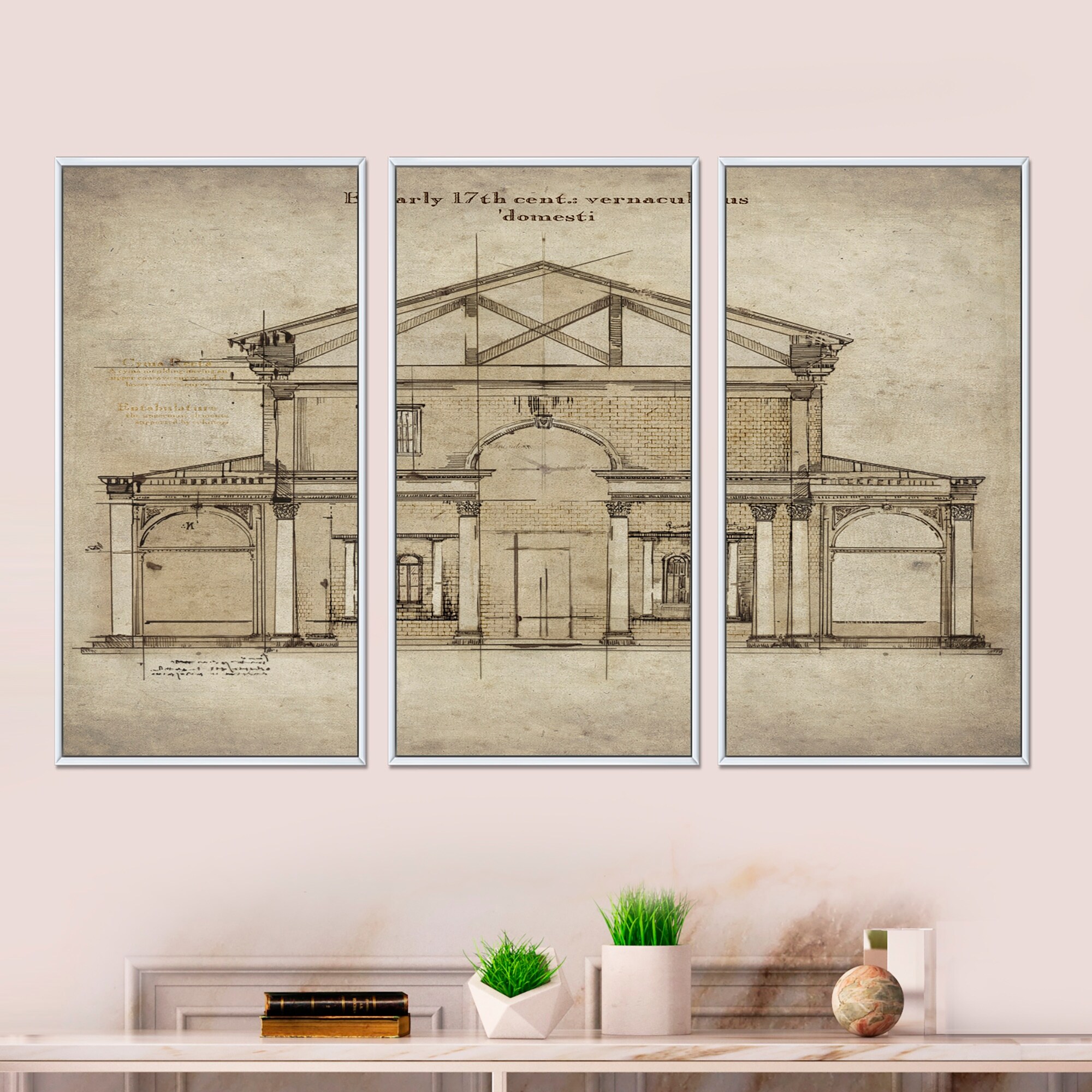 Designart "Antique Facade Old Style Architecture Sketch I" Traditional Framed Wall Decor Set of 3 - 4 Colors of Frames