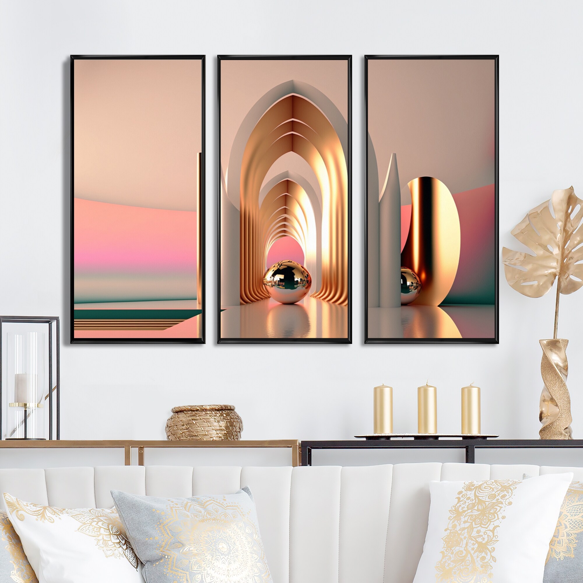 Designart "Futuristic Golden Globe Architecture II" Modern Abstract Framed Canvas Wall Art Print - 3 Panels