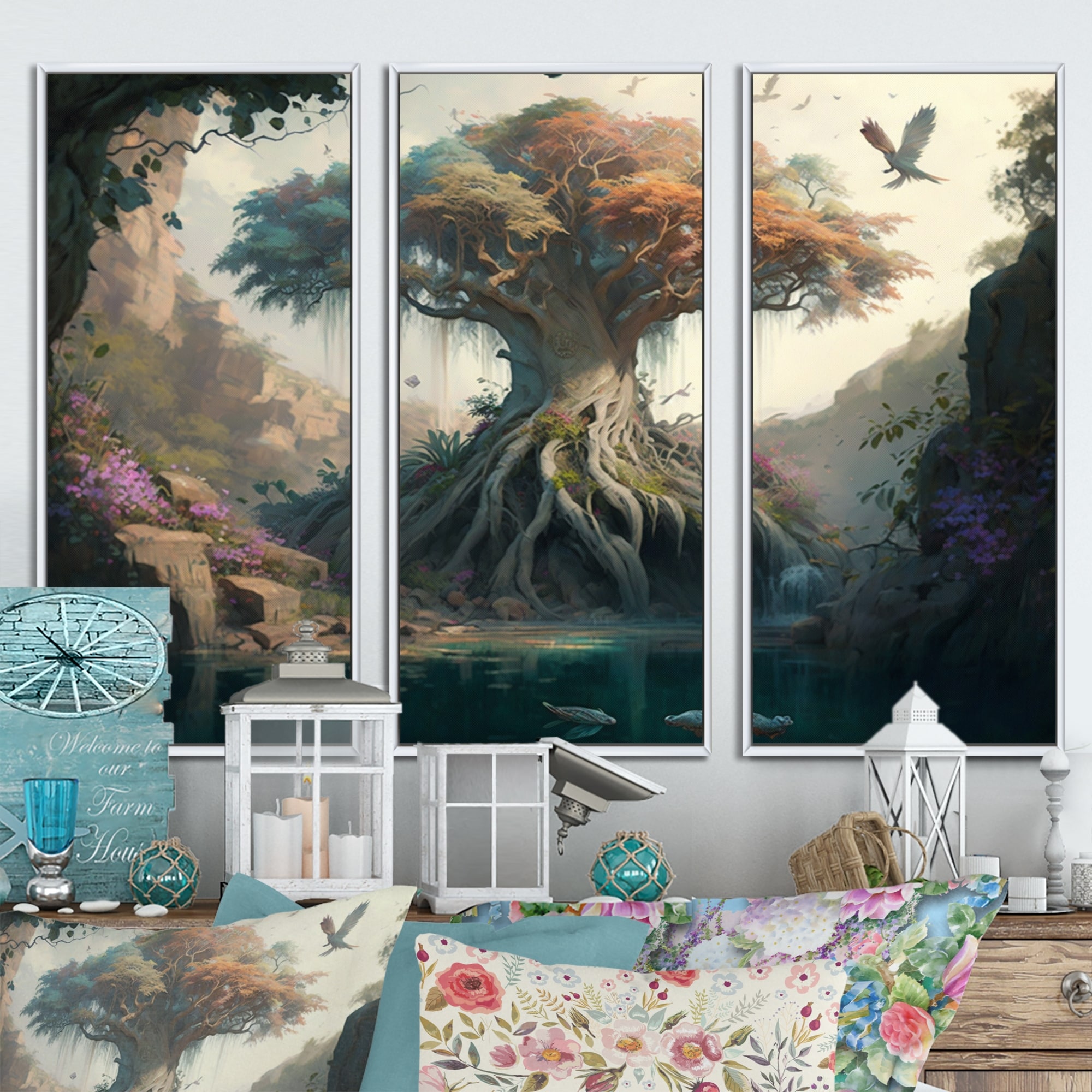 Designart "Tree At the Center of Jungle Paradise II" Tree Framed Canvas Art Print - 3 Panels