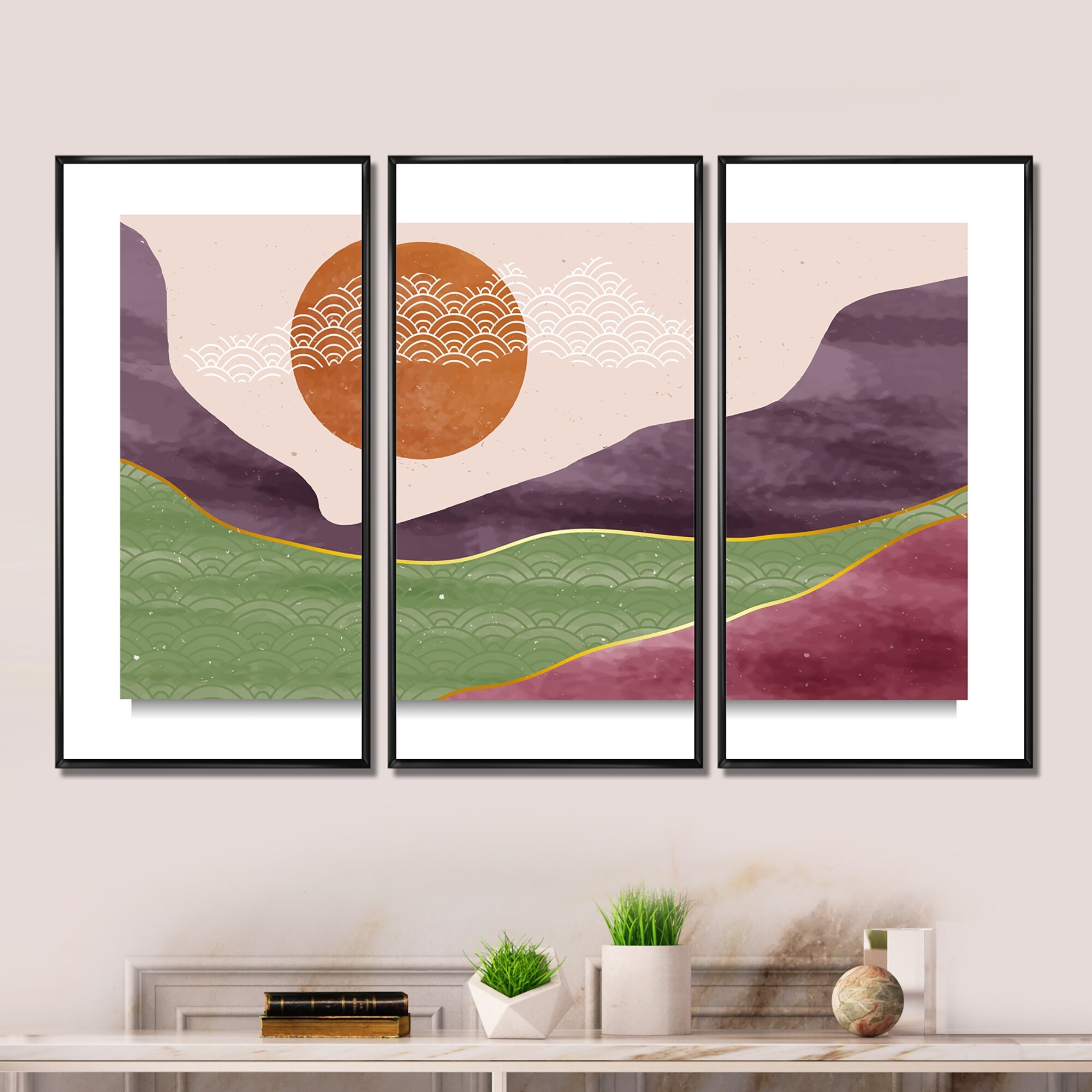 Designart "Abstract Landscapes With Mountain Moon & River" Modern Framed Artwork Set of 3 - 4 Colors of Frames