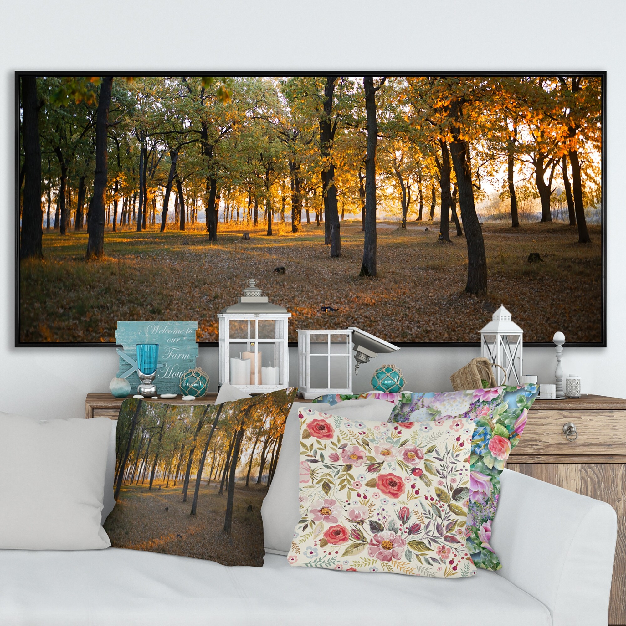 Designart "Sunrise On Autumn Forest" Landscapes Framed Canvas artwork
