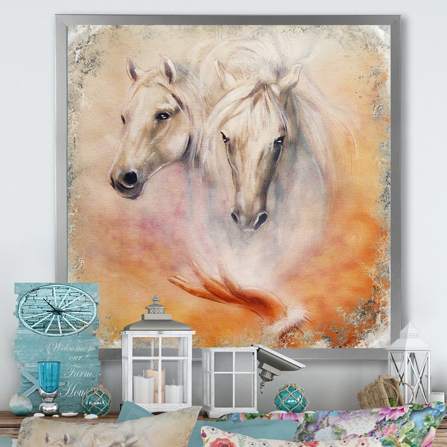 Designart "Vintage Of Two White Horses" Farmhouse Framed artwork
