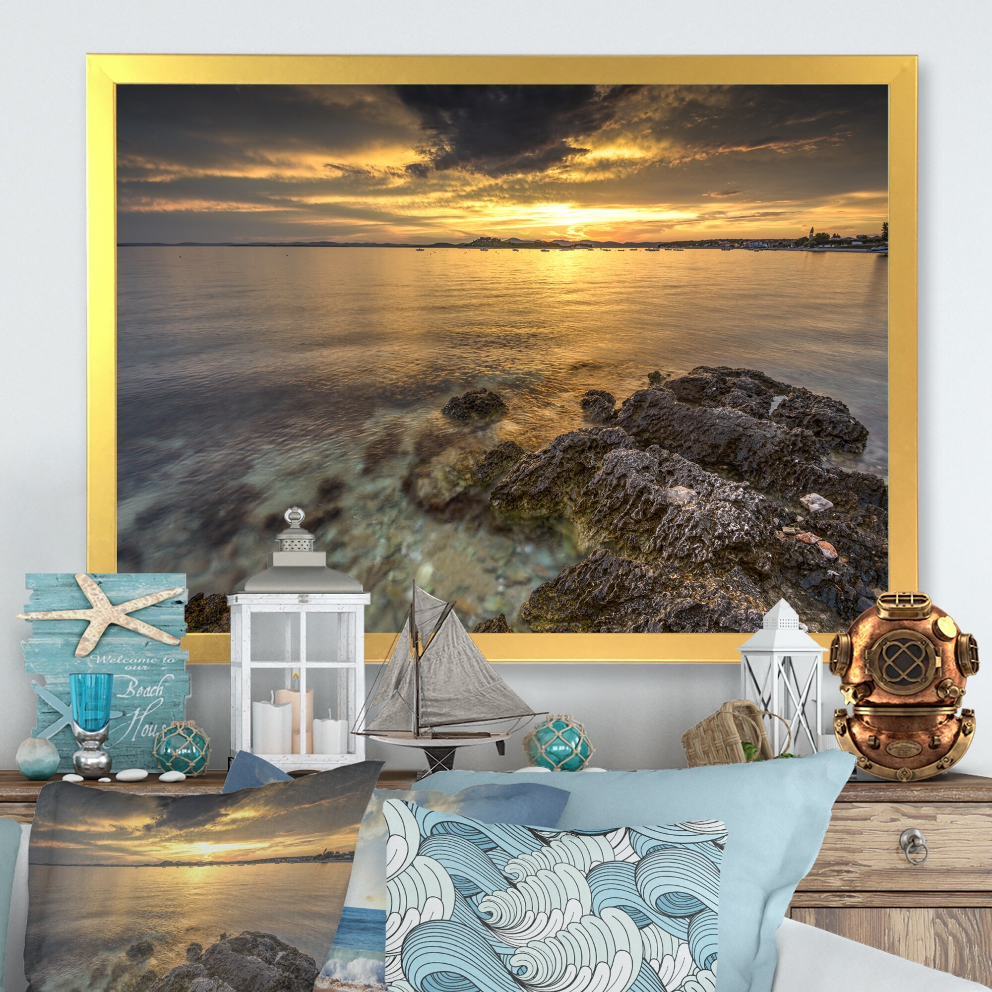 Designart "Orange Sunset Over the Sea III" Nautical & Coastal Framed artwork