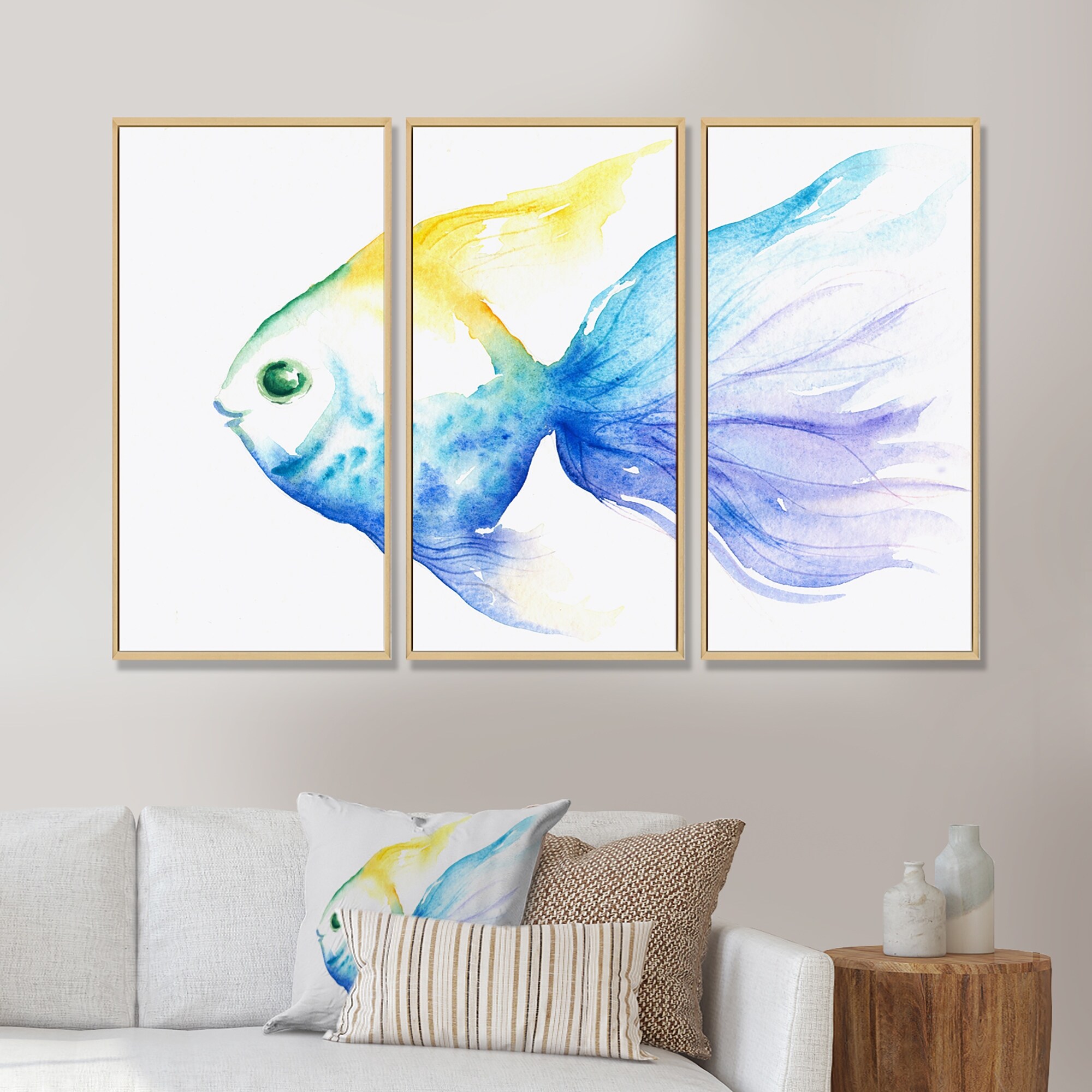 Designart "Lovely Blue Fish Watercolor" Animal Framed Artwork Set of 3 - 4 Colors of Frames