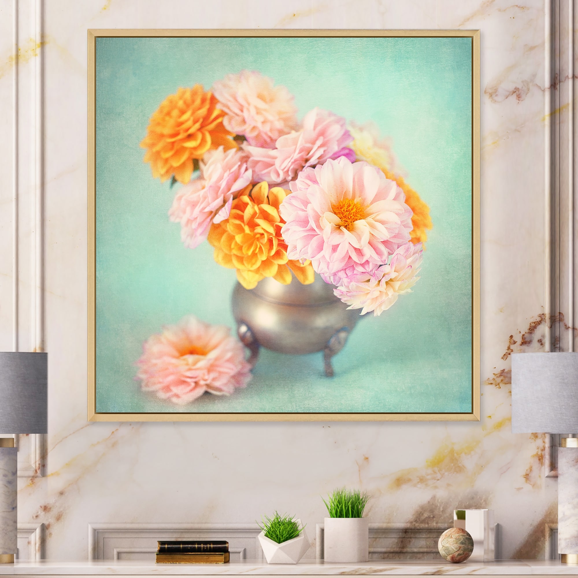 Designart "Vintage Bouquet of Pink And Yellow Dahlias" Traditional Framed Canvas artwork