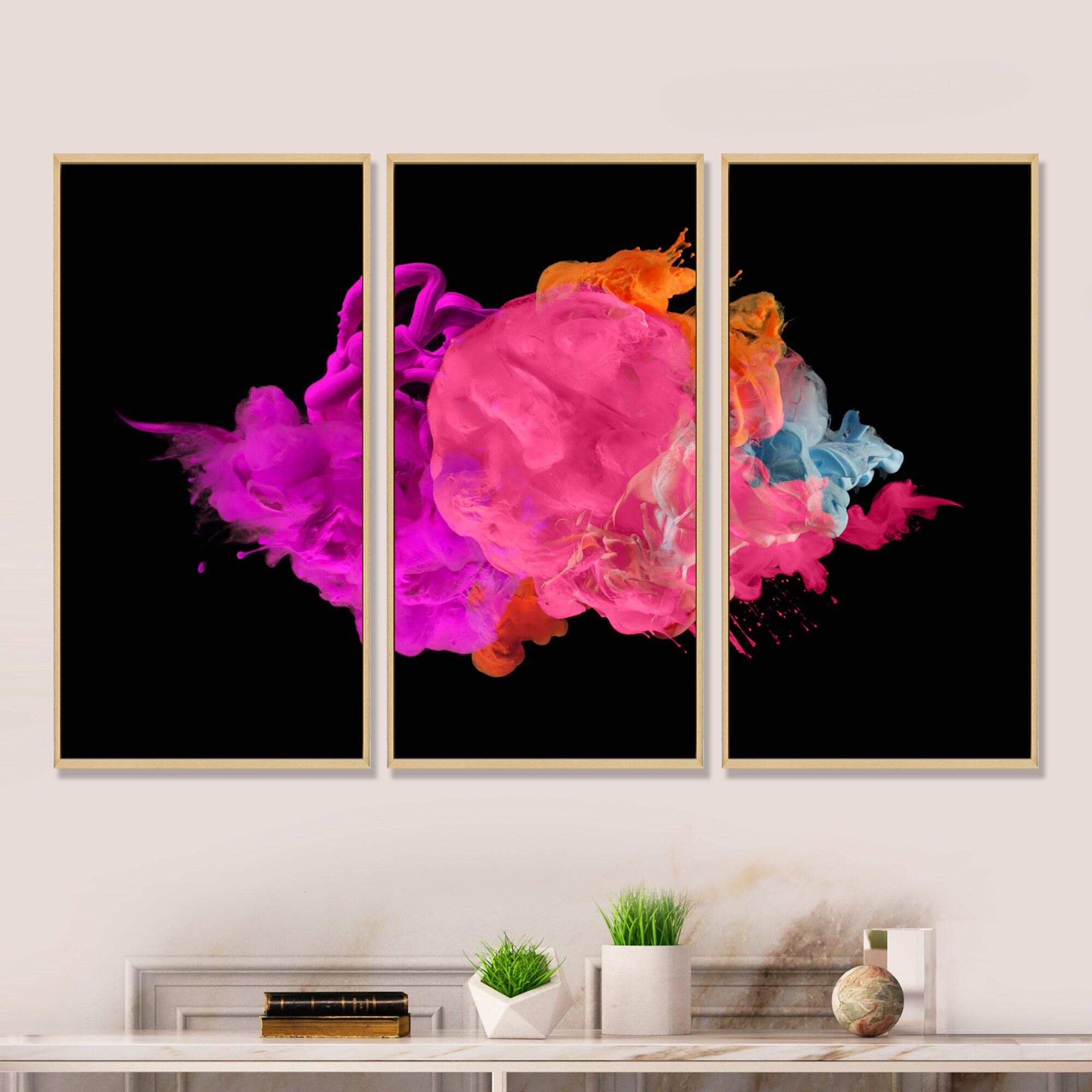 Designart "Fuchia And Pink Ink Art on Black" Modern Framed Artwork Set of 3 - 4 Colors of Frames