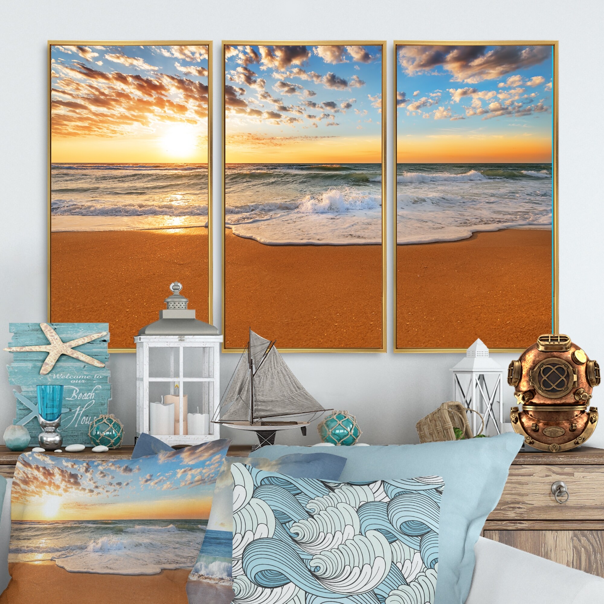Designart "Incredible Seashore under Cloudy Sky" Sea & Shore Framed Artwork Set of 3 - 4 Colors of Frames