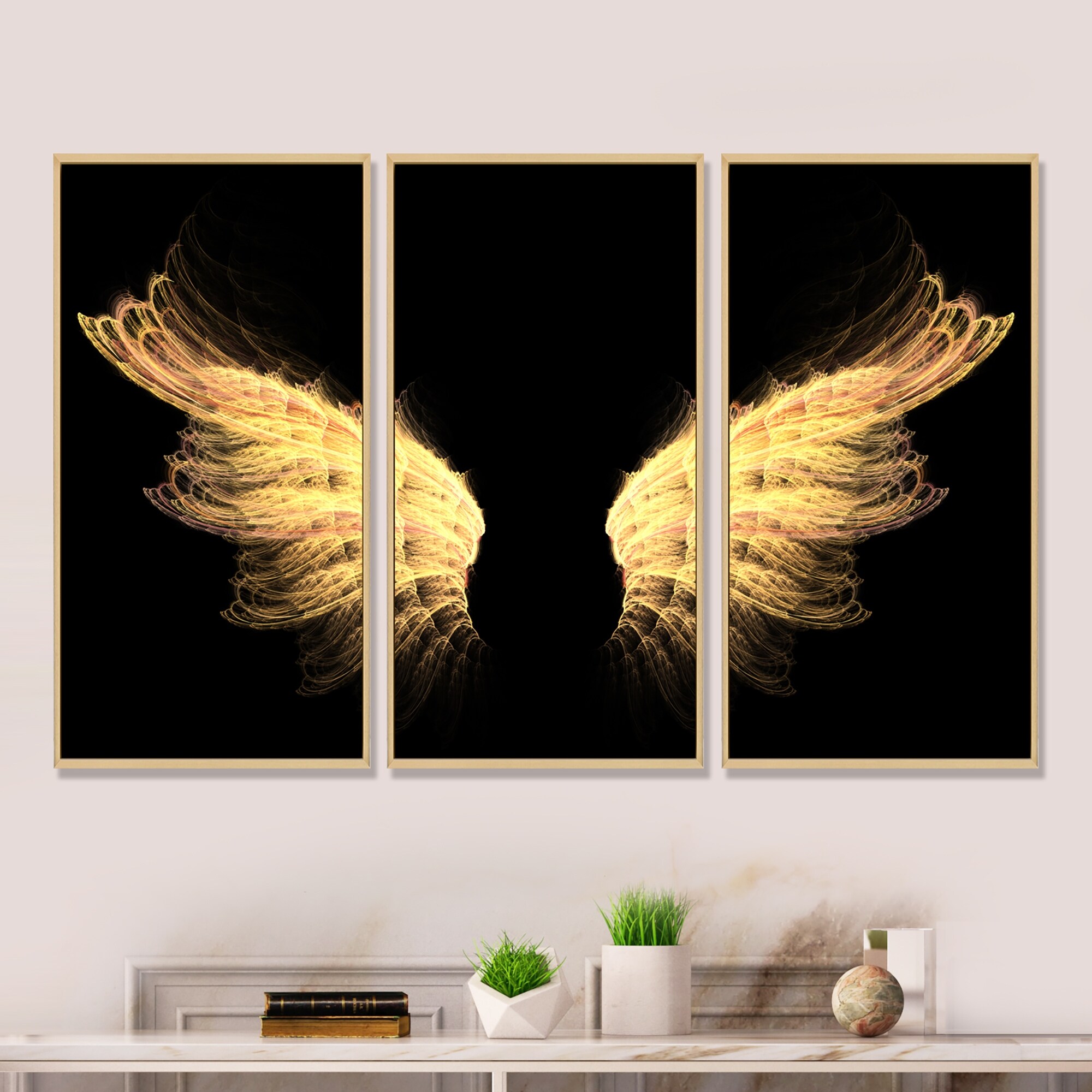 Designart "Hell Gold Wings" Abstract Framed Artwork Set of 3 - 4 Colors of Frames