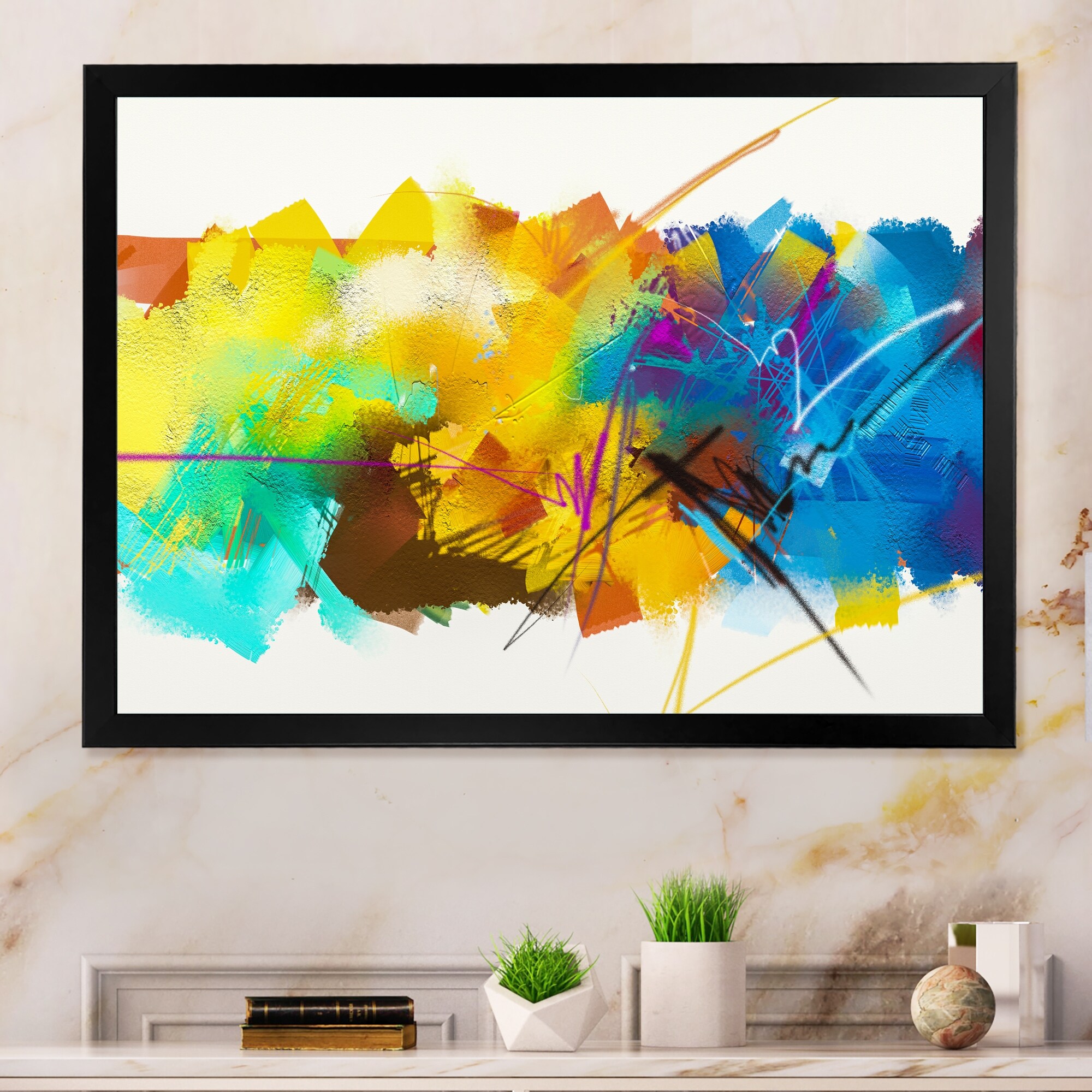 Designart "Yellow And Blue Paint Storm Impression" Modern Framed artwork