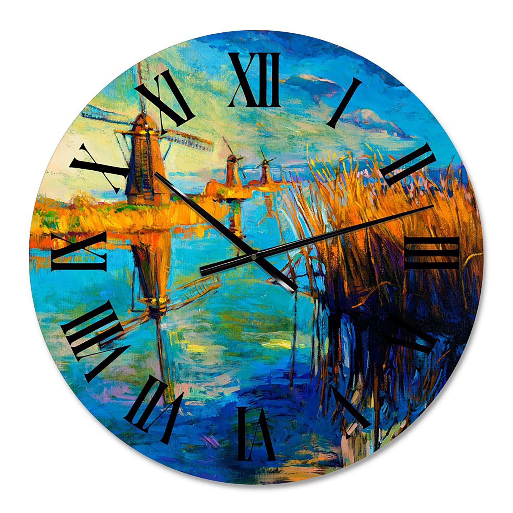 Designart 'Windmills By the Deep Blue Lake' Nautical & Coastal wall clock