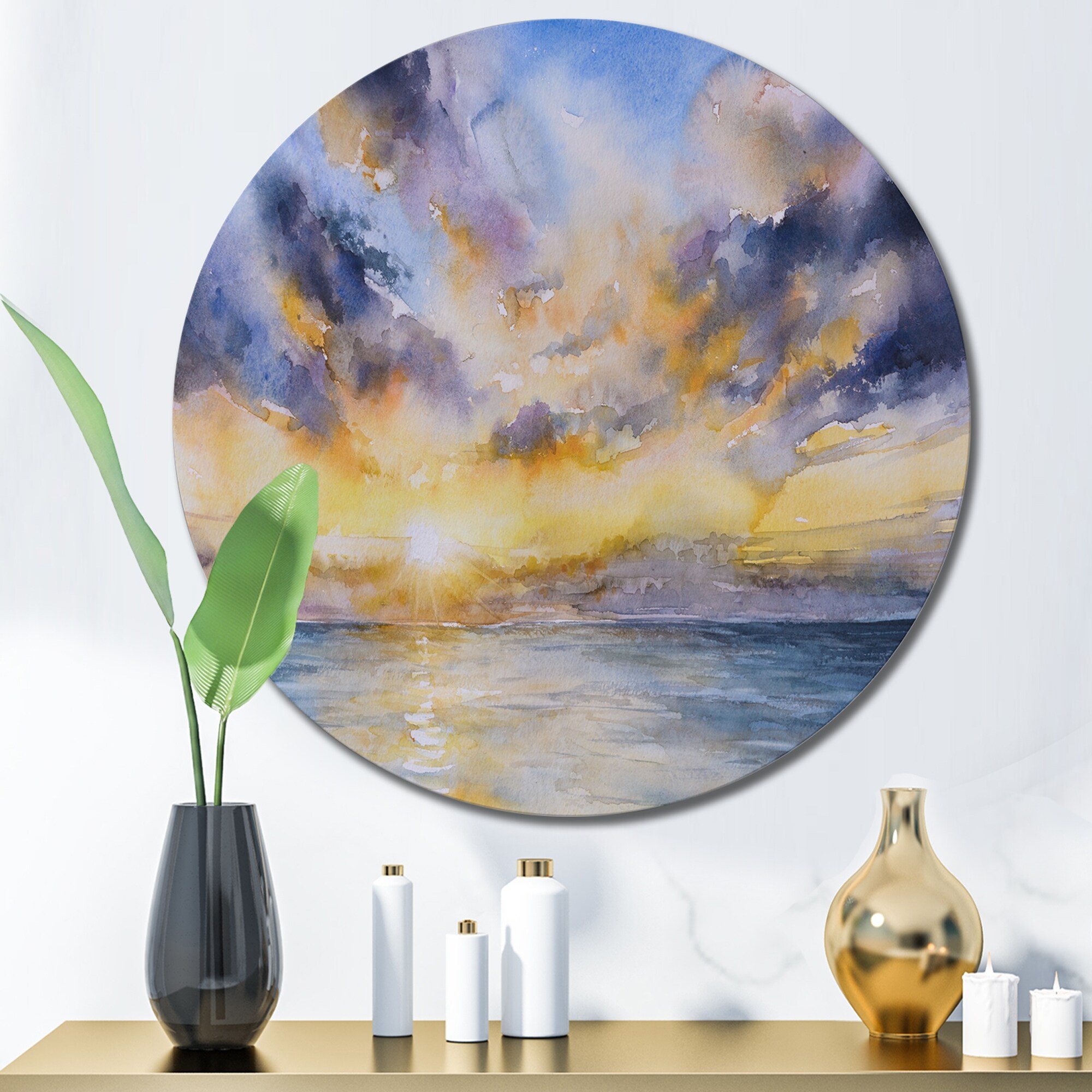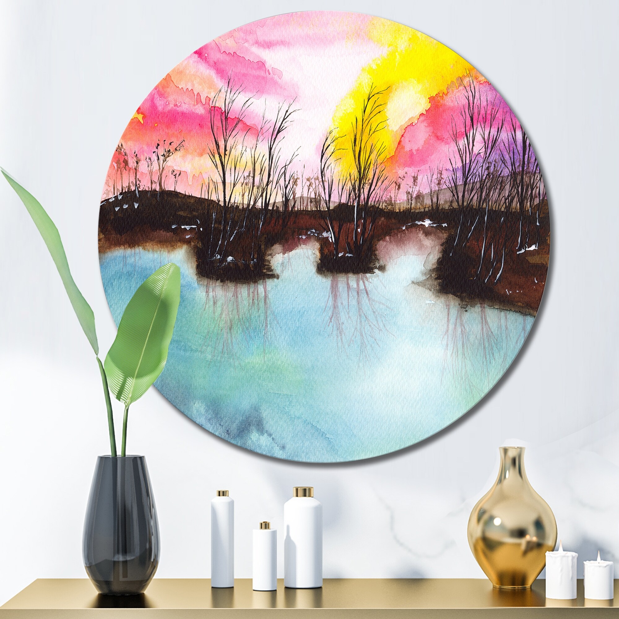 Designart 'Yellow Sunset Over Blue Lake' Nautical & Coastal Metal Circle Wall Art