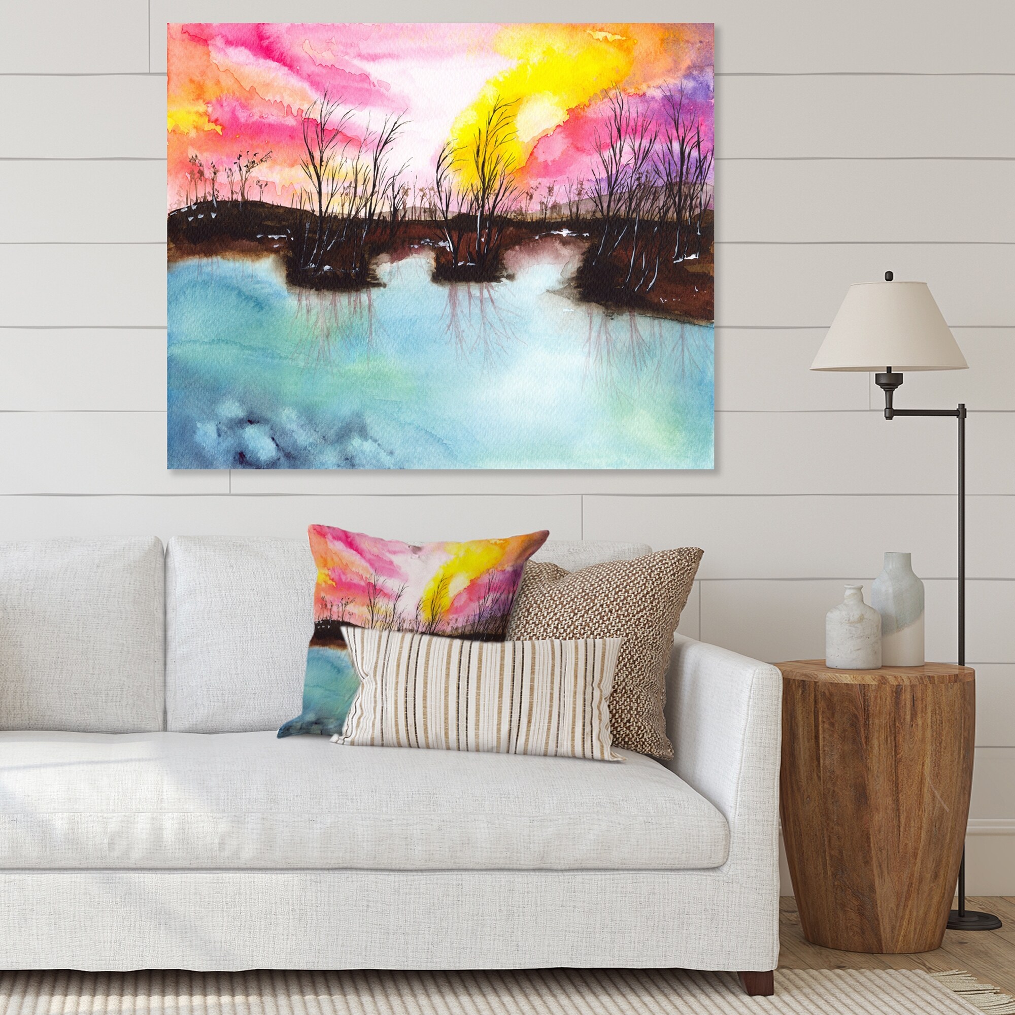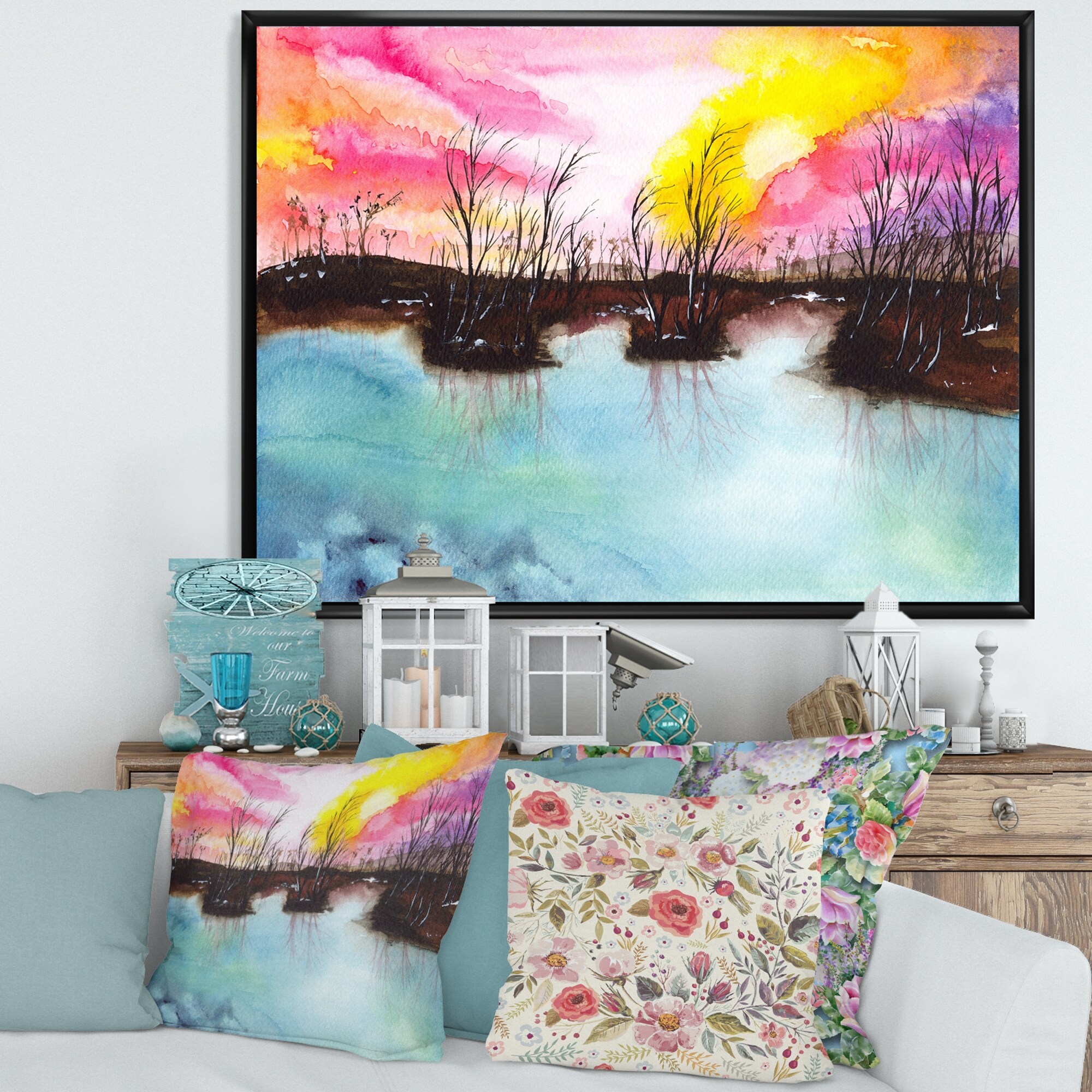 Designart "Yellow Sunset Over Blue Lake" Nautical & Coastal Framed Art Print