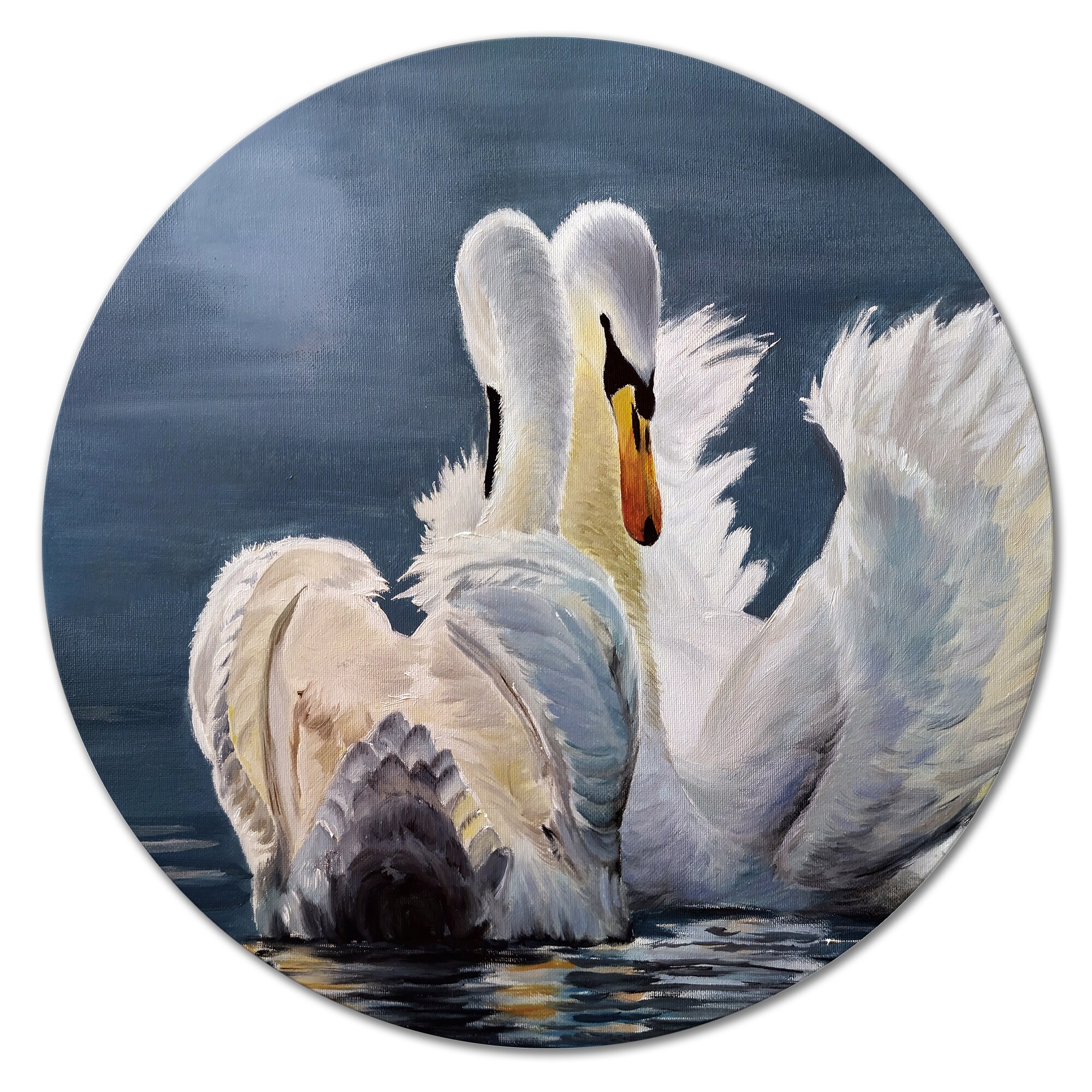 Designart 'Two Graceful White Swans on A Misty Blue Lake' Nautical & Coastal Metal Circle Wall Art