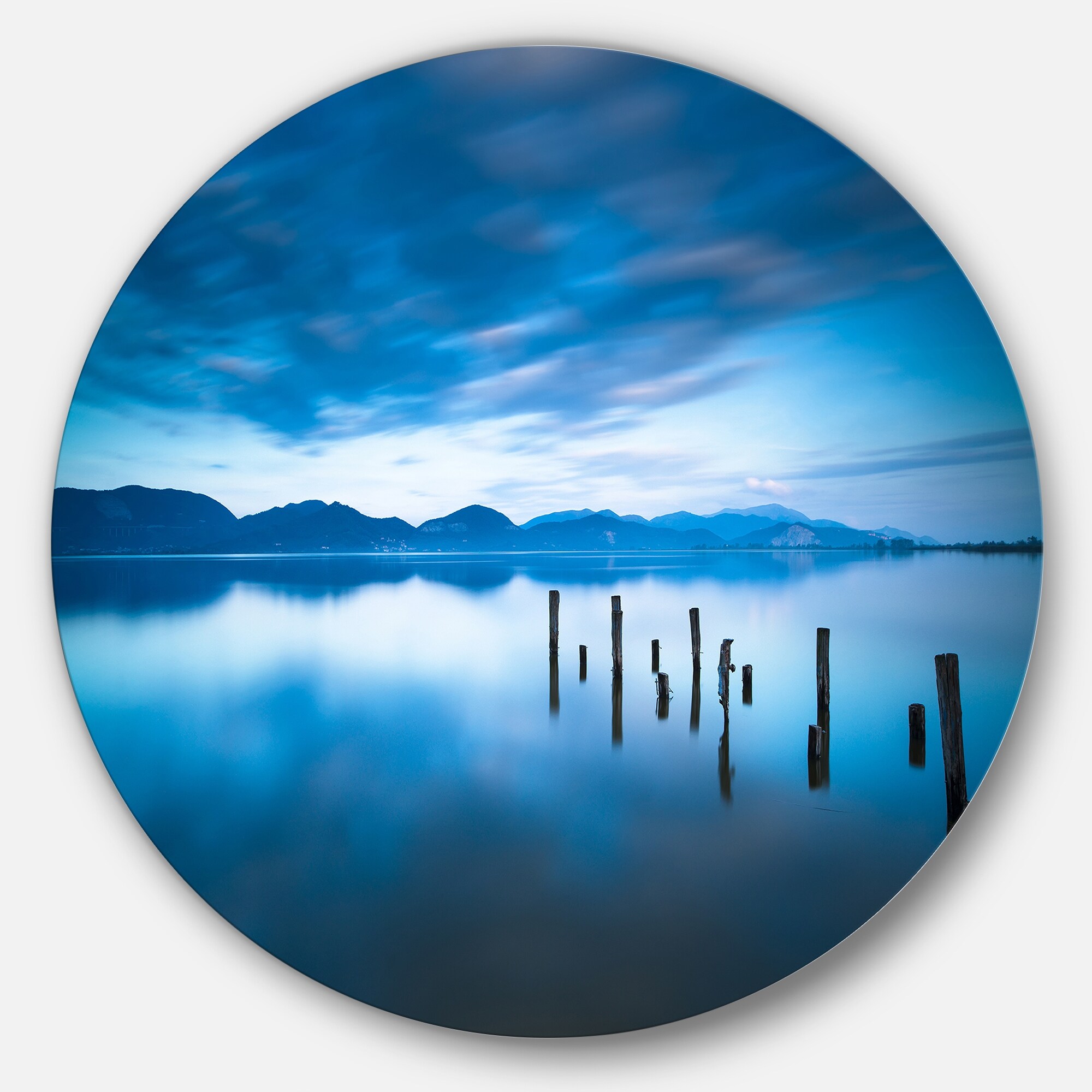 Designart 'Blue Lake with Wooden Pier' Landscape Photo Large Disc Metal Wall art