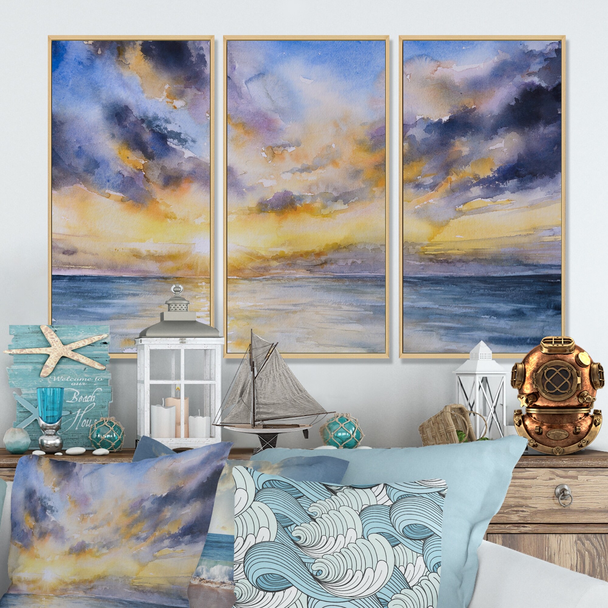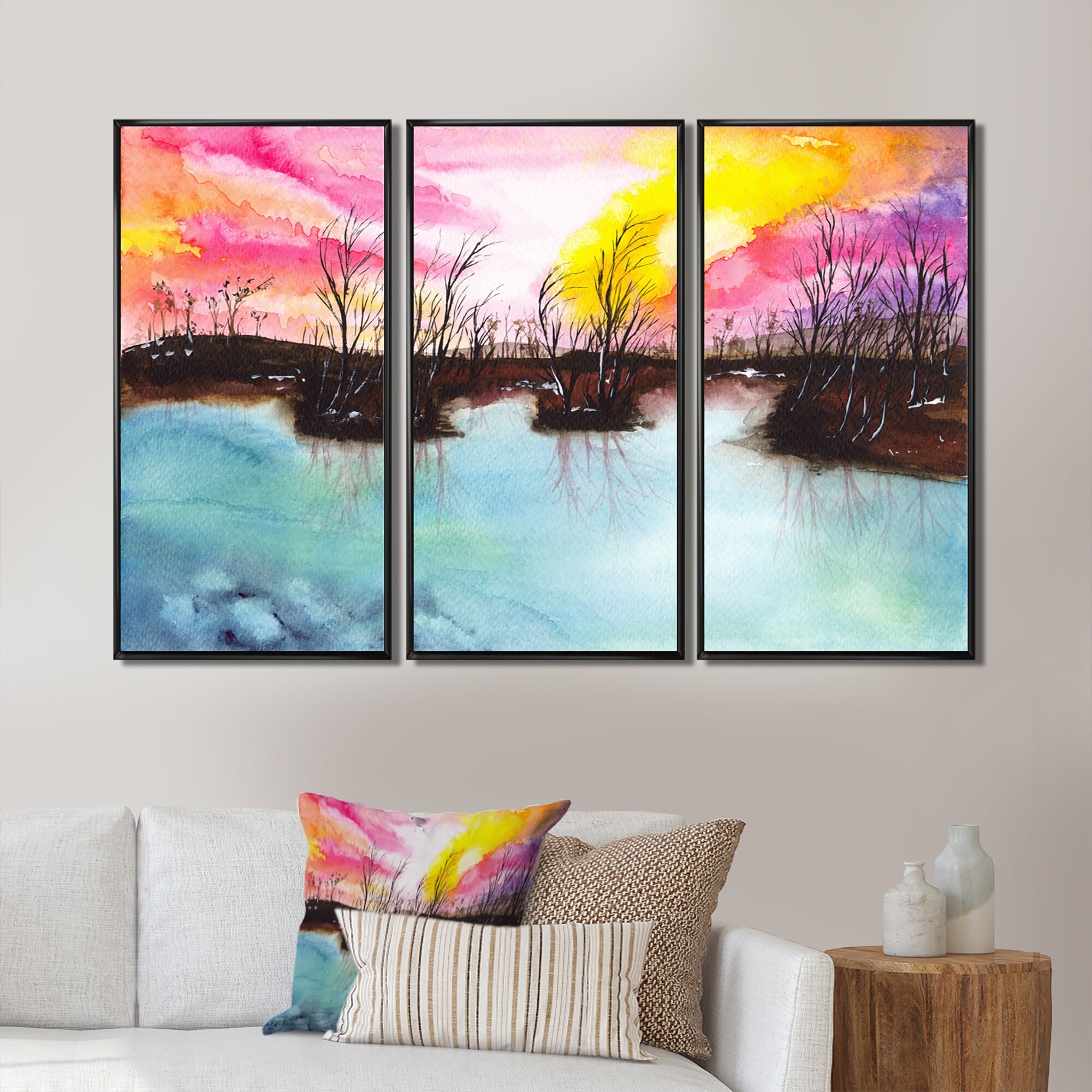Designart "Yellow Sunset Over Blue Lake" Nautical & Coastal Framed Artwork Set of 3 - 4 Colors of Frames