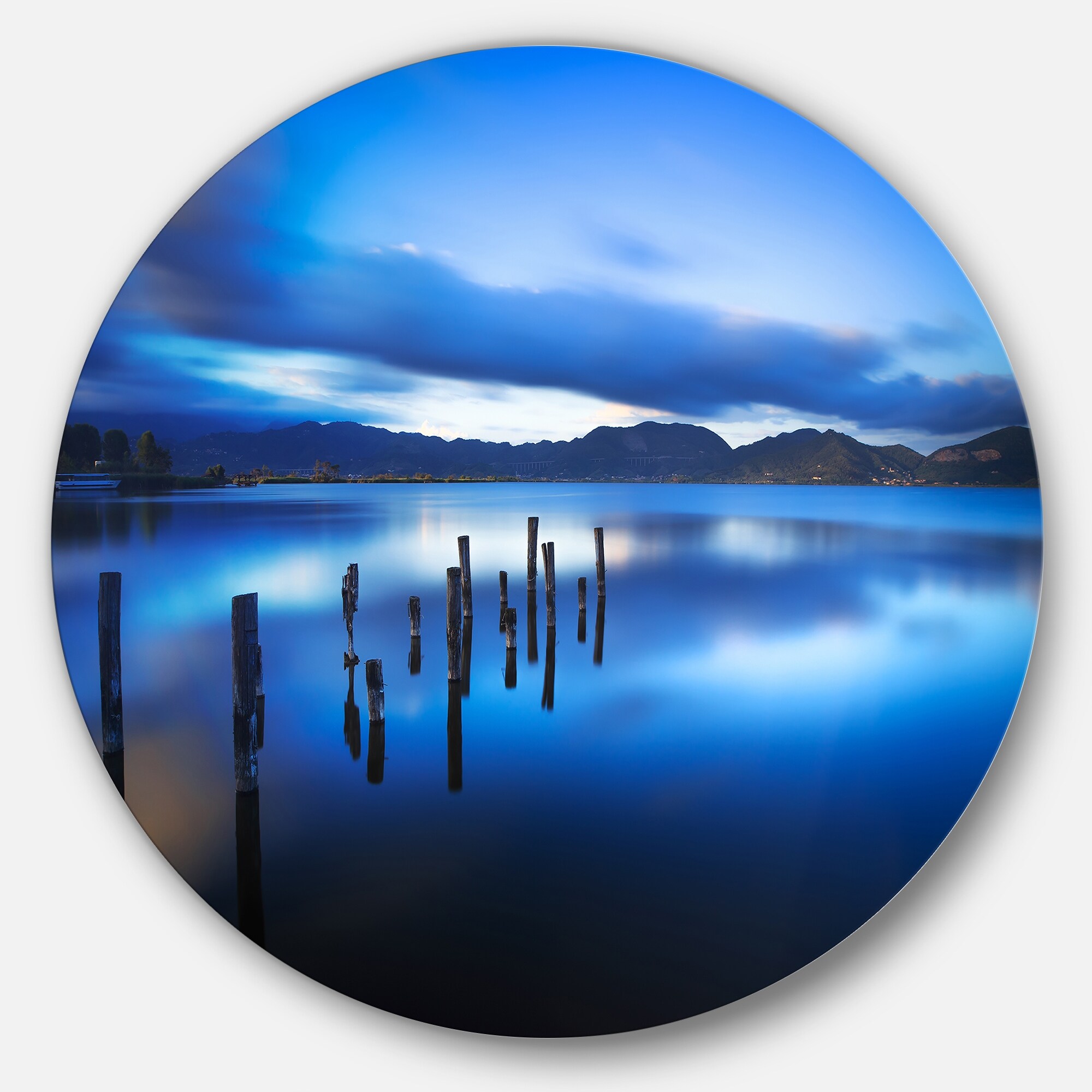 Designart 'Blue Lake Sunset with Pier' Landscape Photo Disc Metal Wall Art