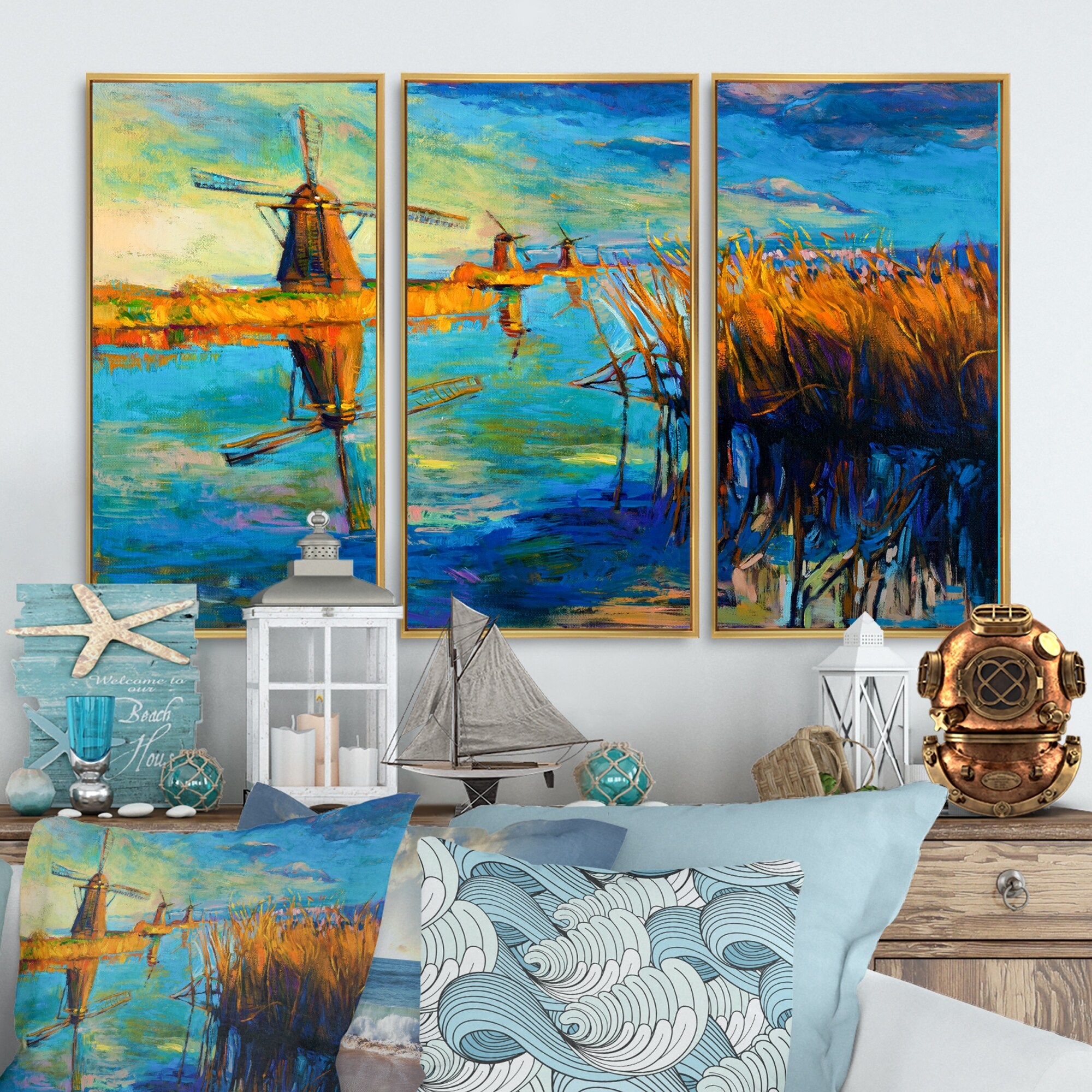 Designart "Windmills By the Deep Blue Lake" Nautical & Coastal Framed Wall Art Set of 3 - 4 Colors of Frames