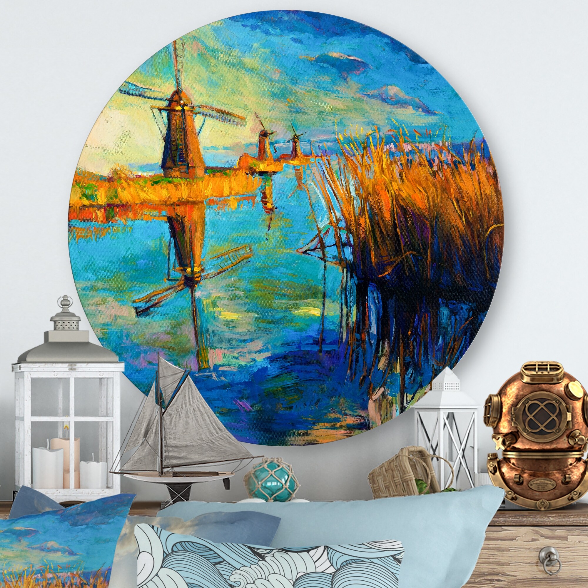 Designart 'Windmills By the Deep Blue Lake' Nautical & Coastal Metal Circle Wall Art