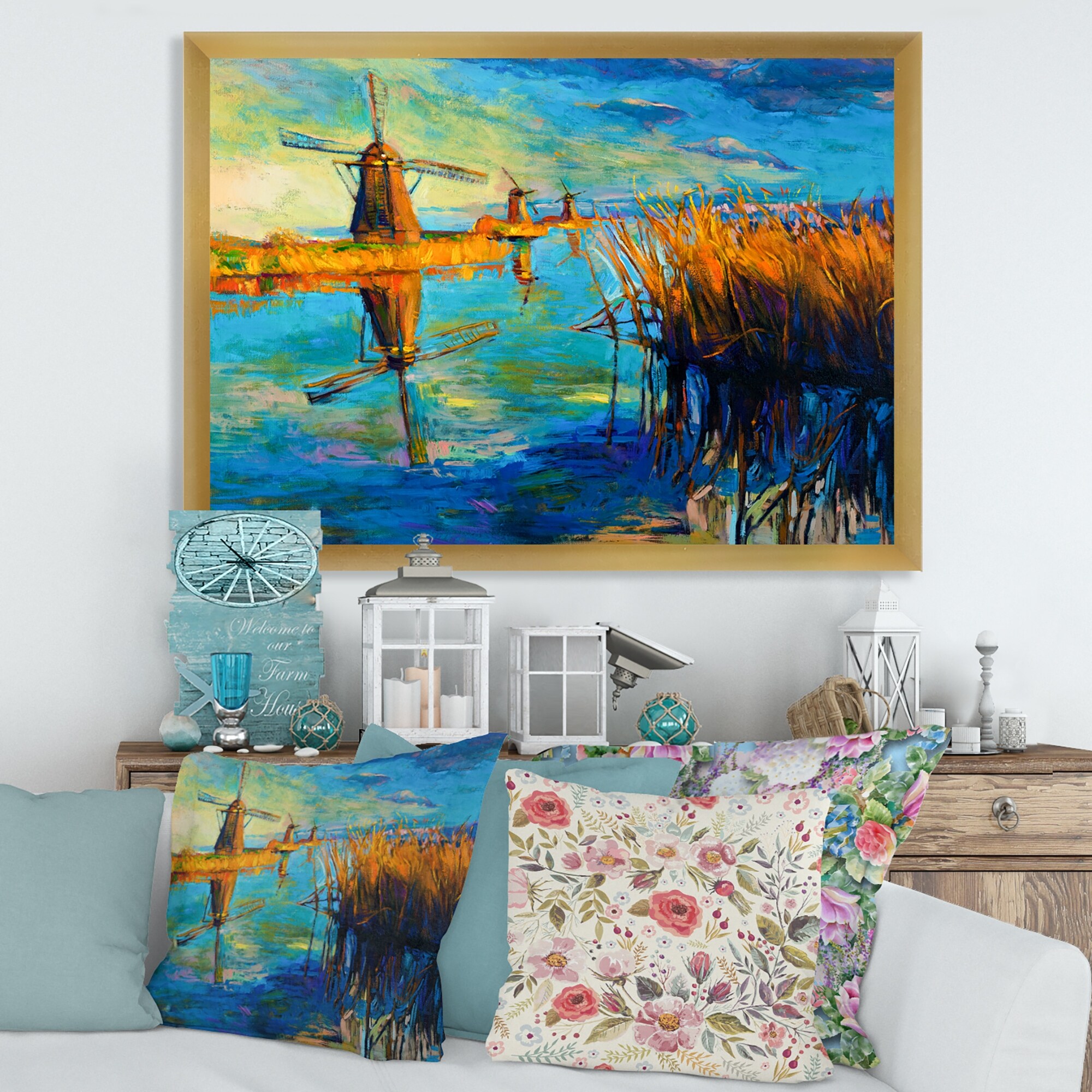 Designart "Windmills By the Deep Blue Lake" Nautical & Coastal Framed Art Print