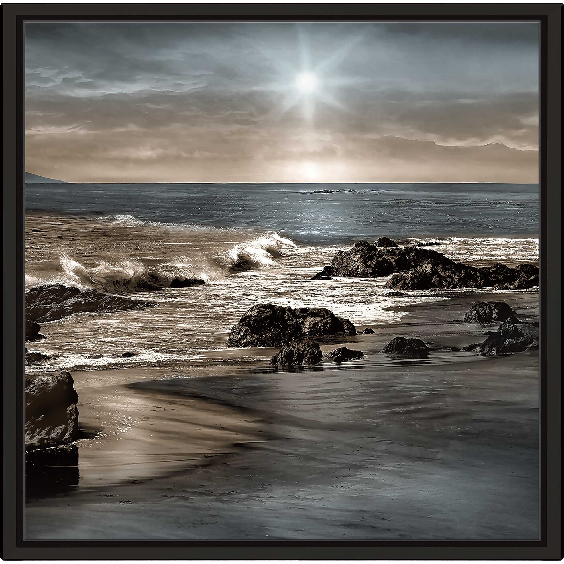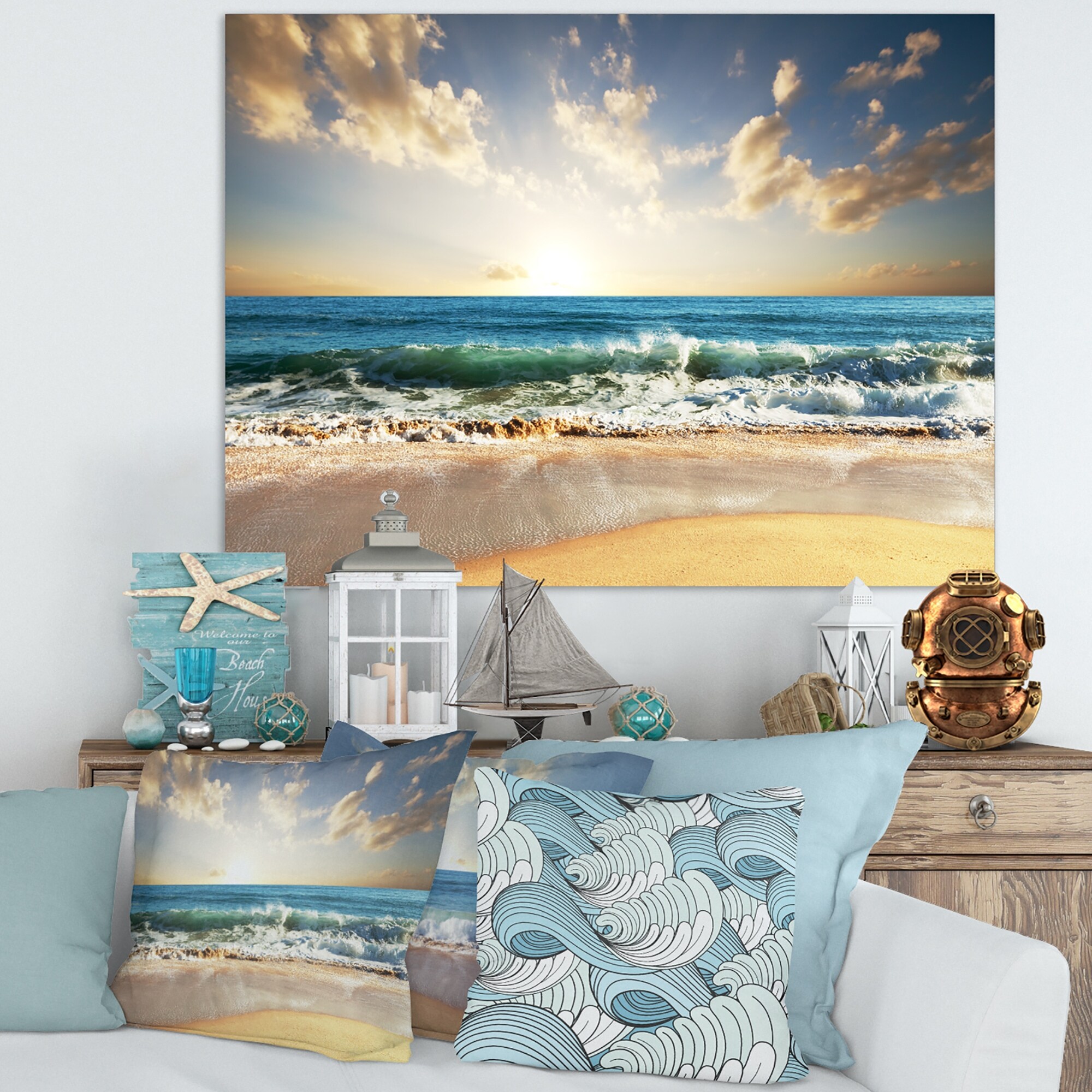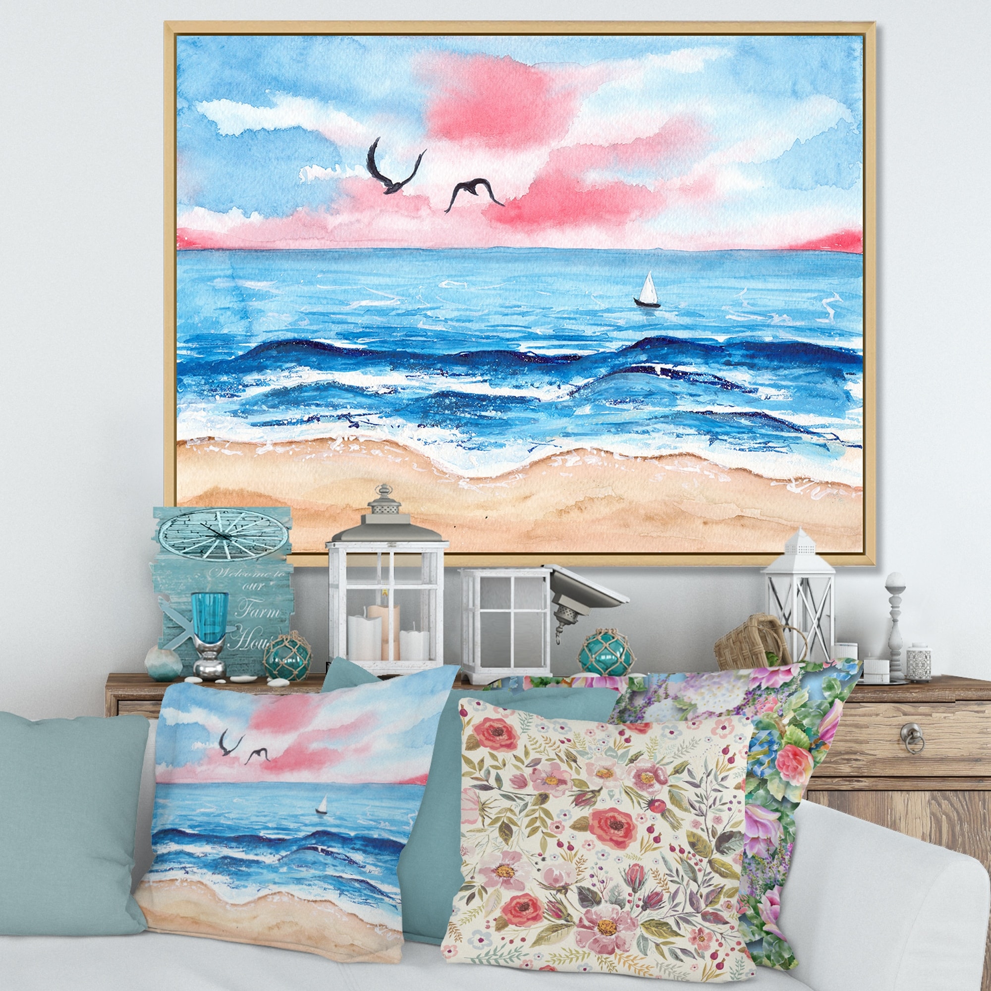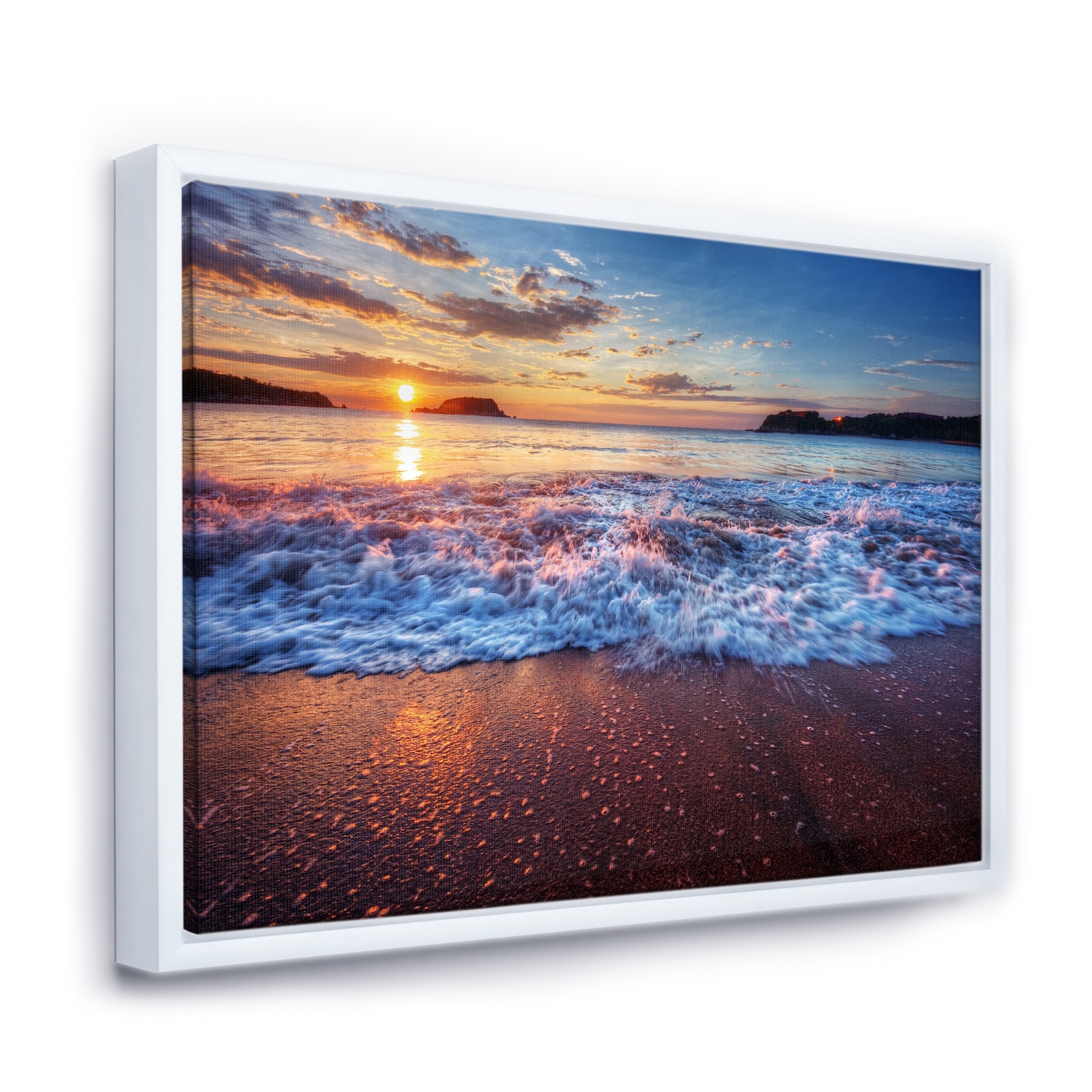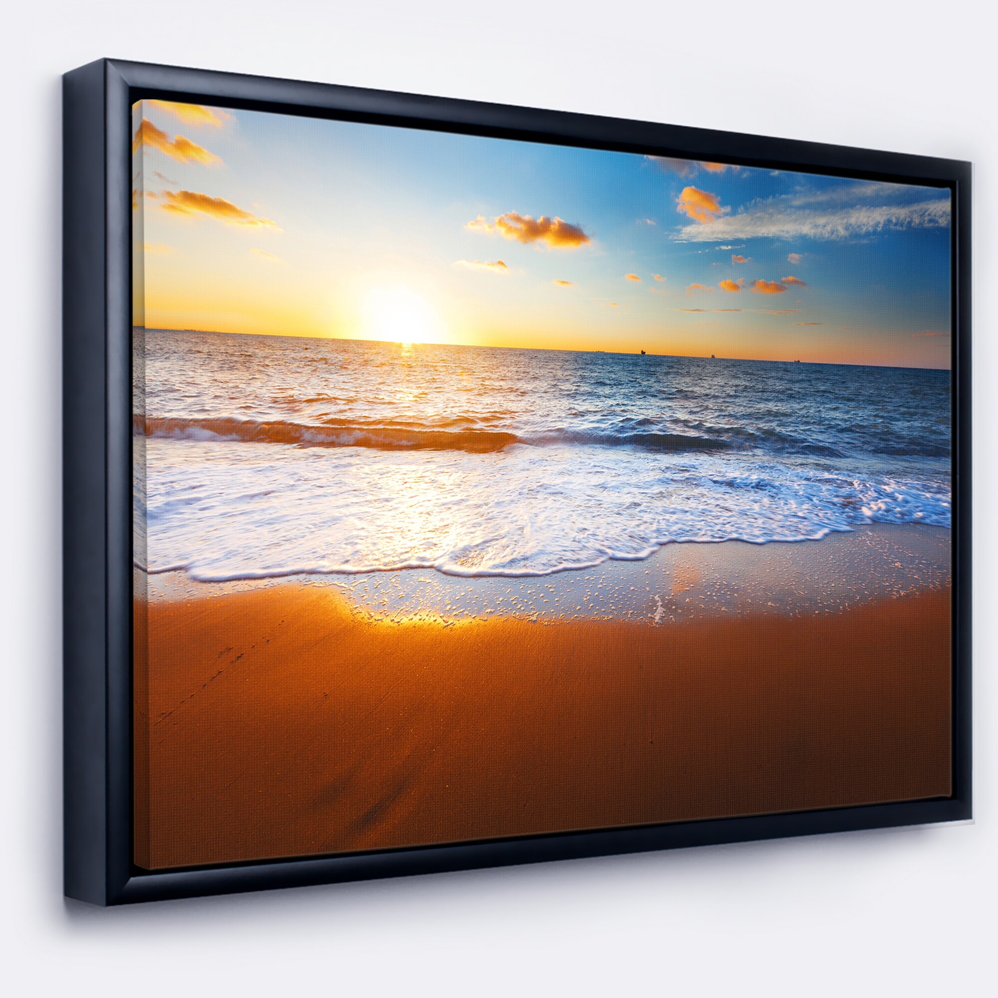 Designart "Sunset On Beautiful Sand Beach With Blue Sea Water" Nautical & Coastal Framed Canvas Wall Art Print