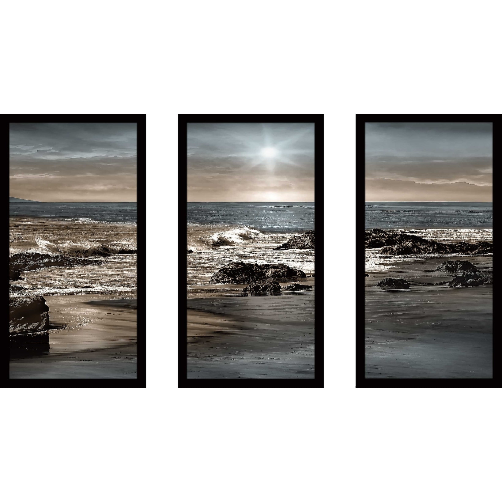 Designart "Blue Sea Sunset on Sandy Coastline" Sea & Shore Framed Art Prints Set of 3 - 4 Colors of Frames