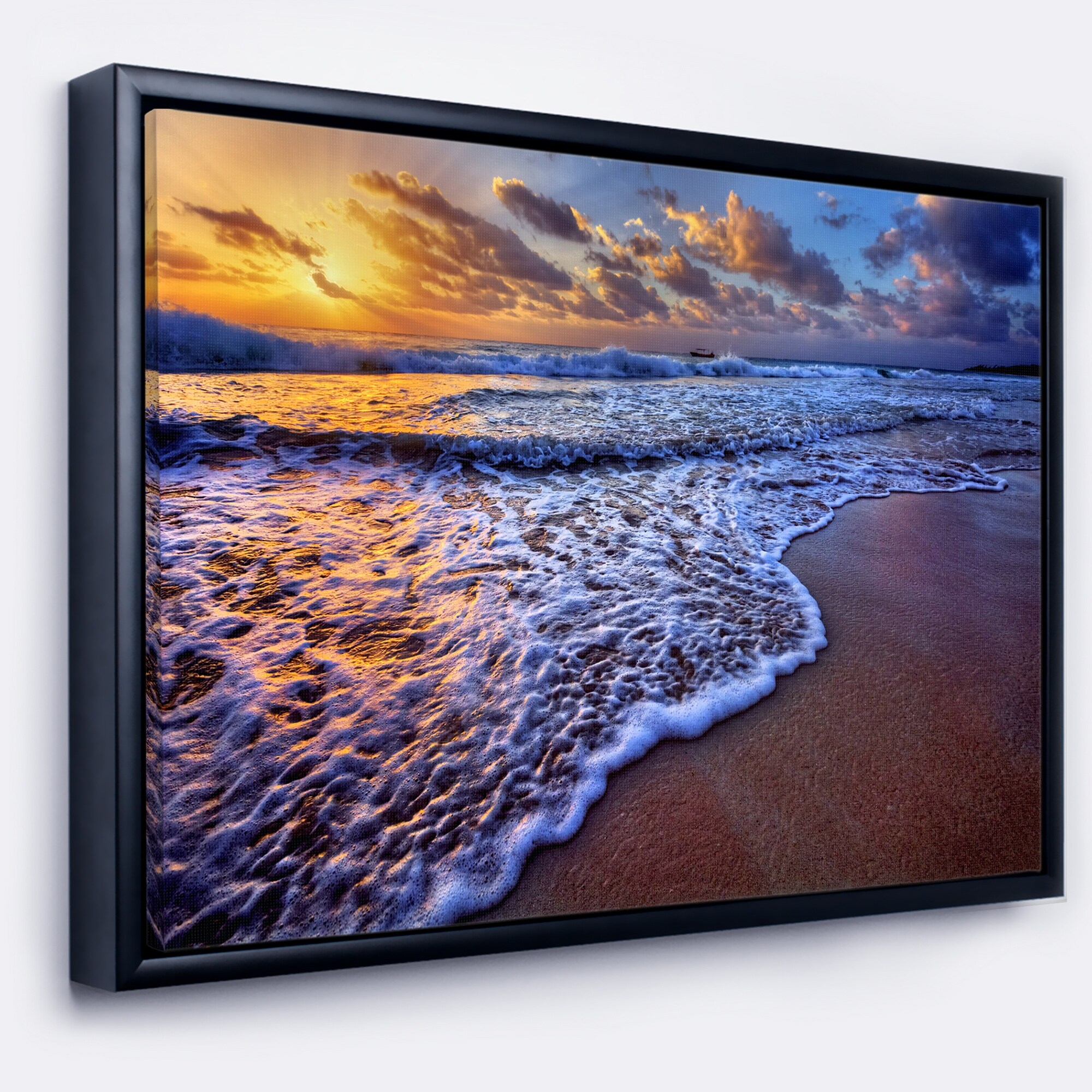 Designart "Sunset over Blue Sea Waves" Seashore Framed Canvas Art Print
