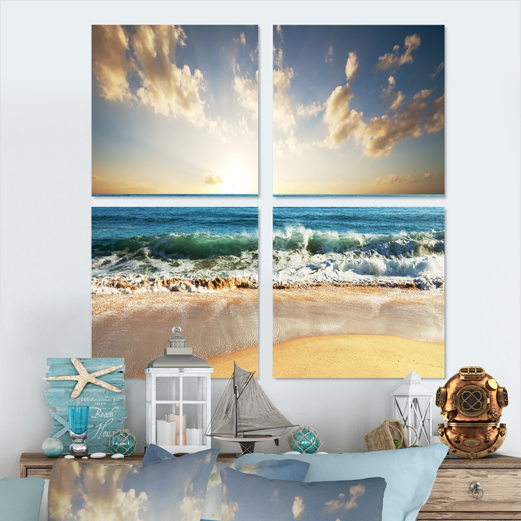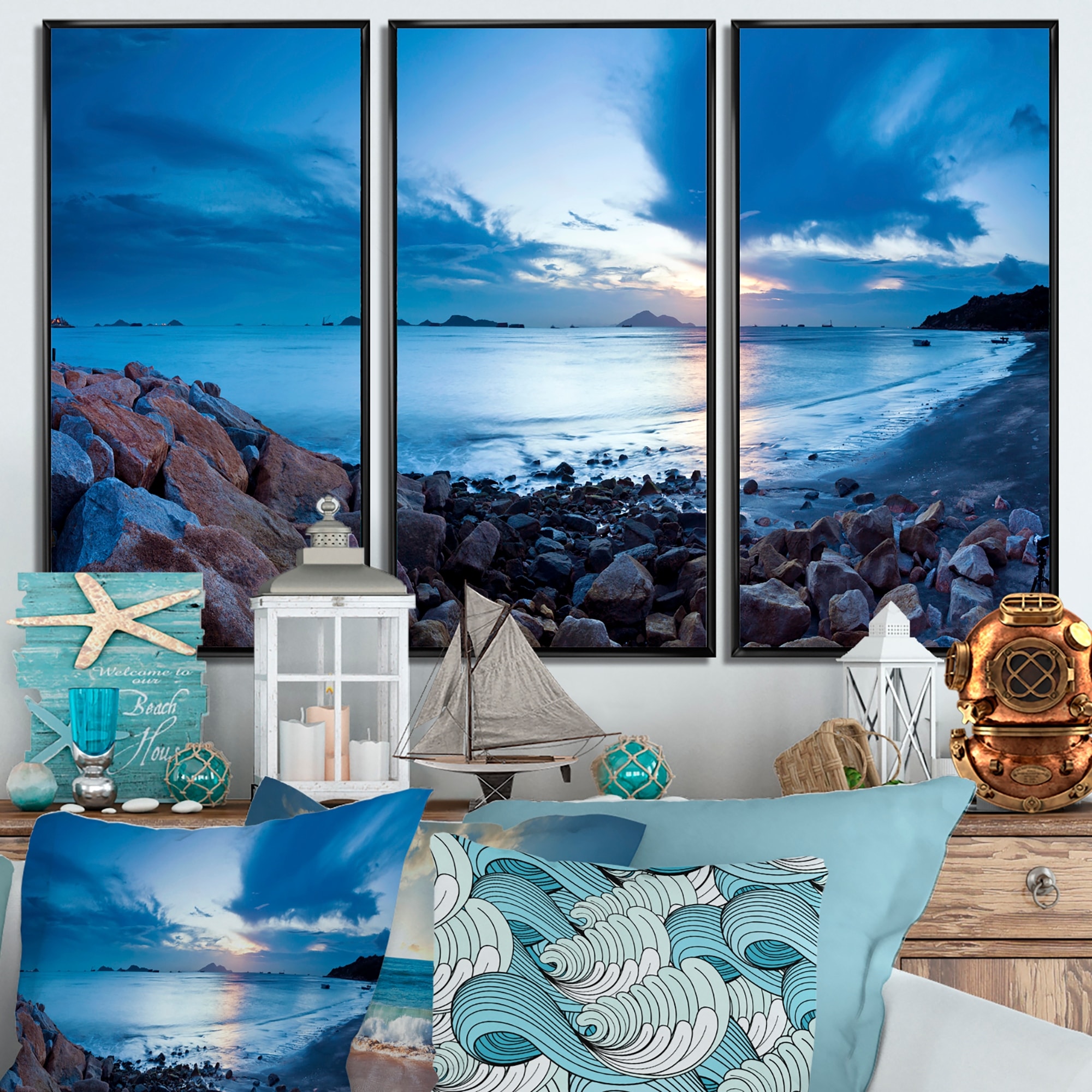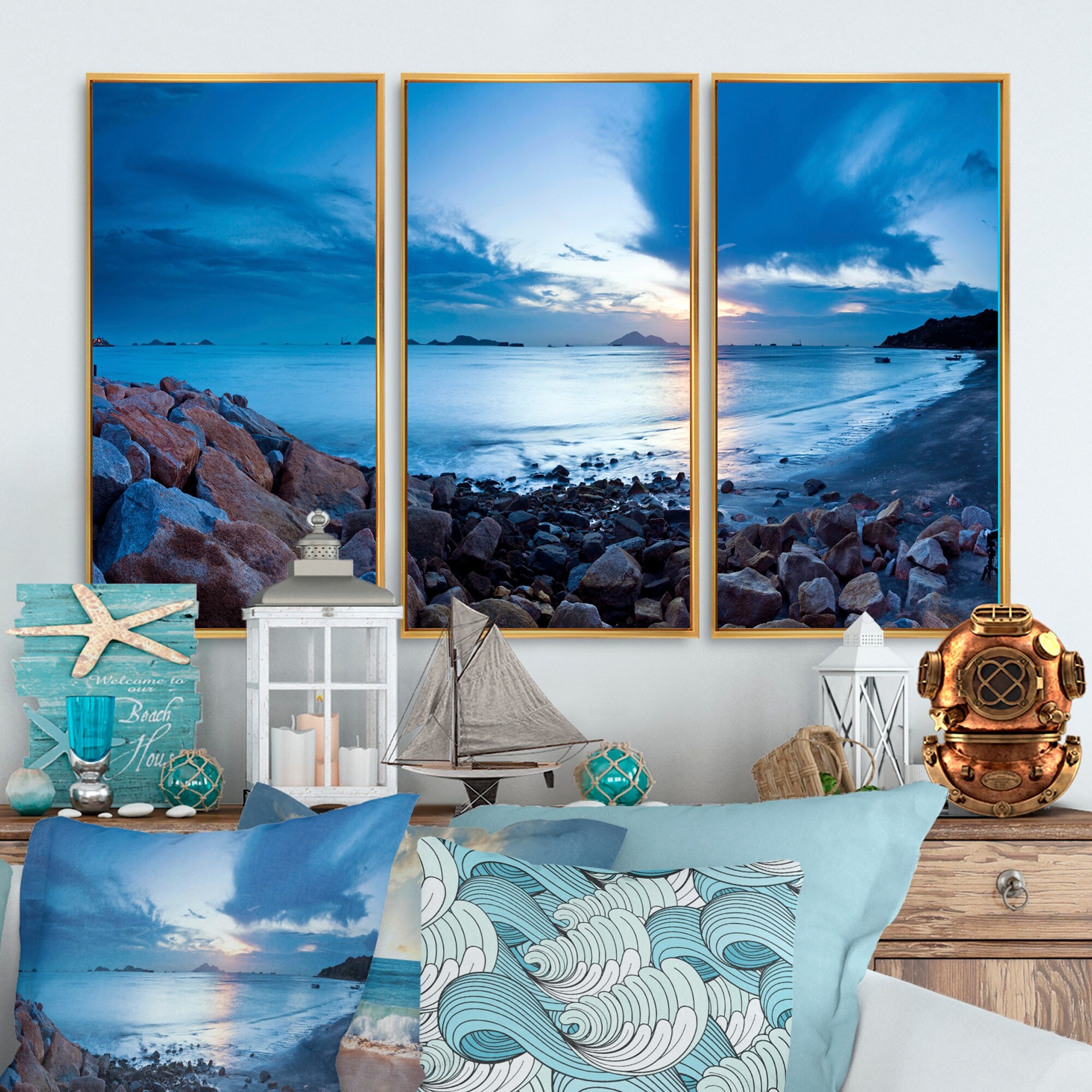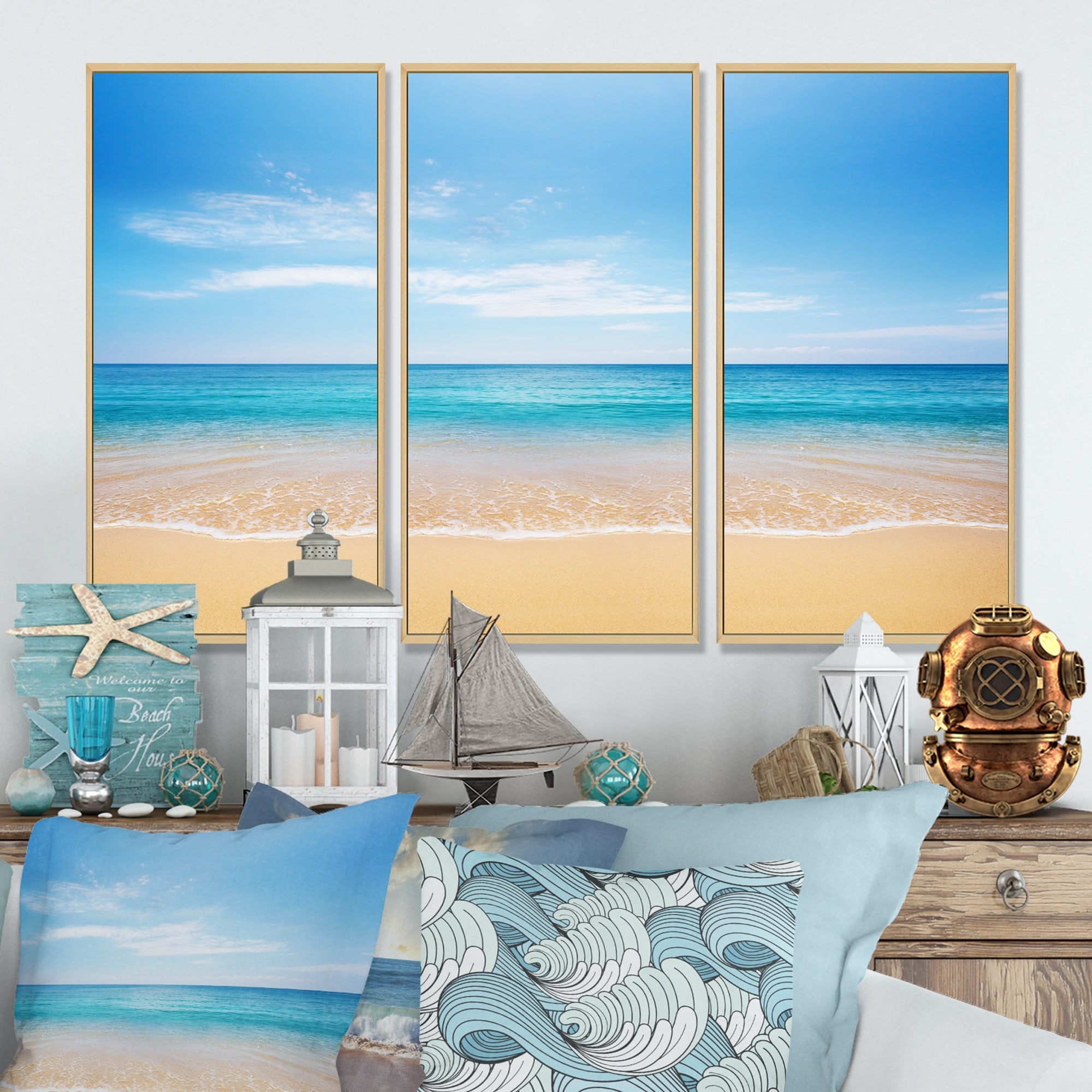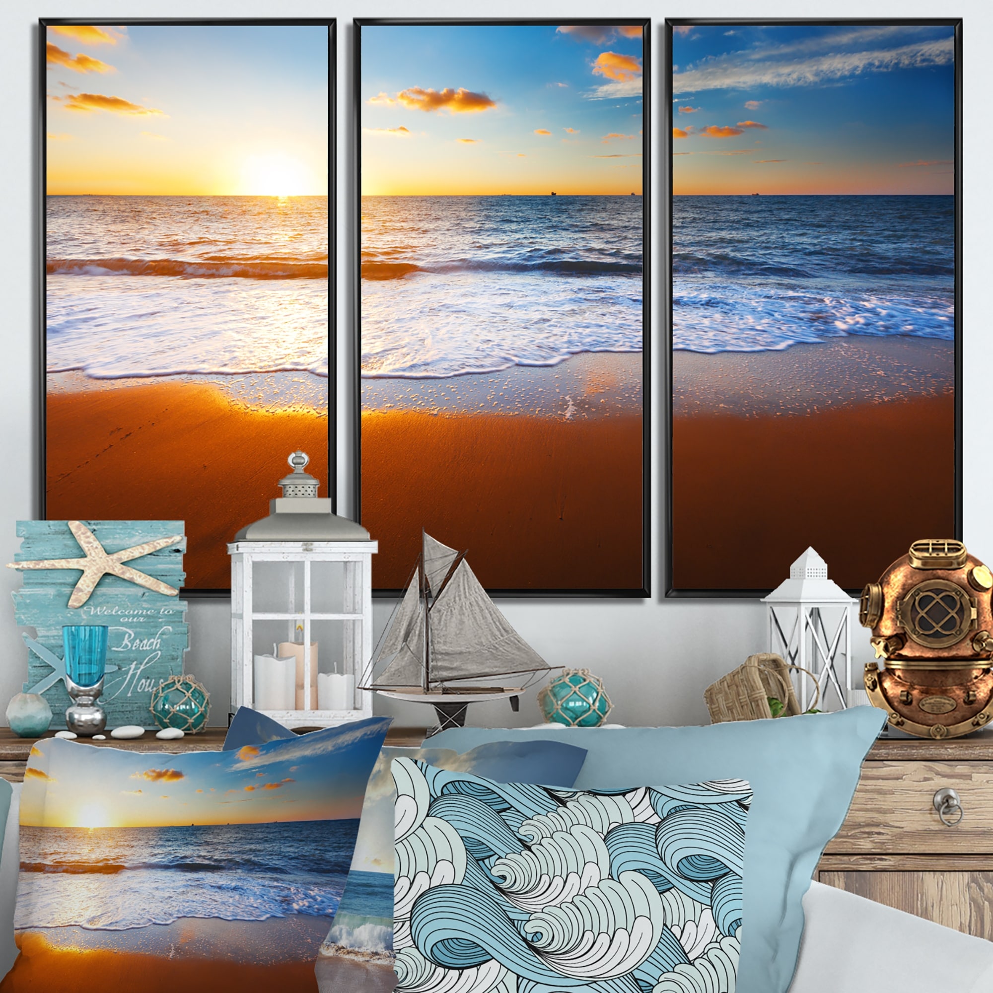 Designart "Sunset On Beautiful Sand Beach With Blue Sea Water" Nautical & Coastal Framed Canvas Wall Art Print - 3 Panels