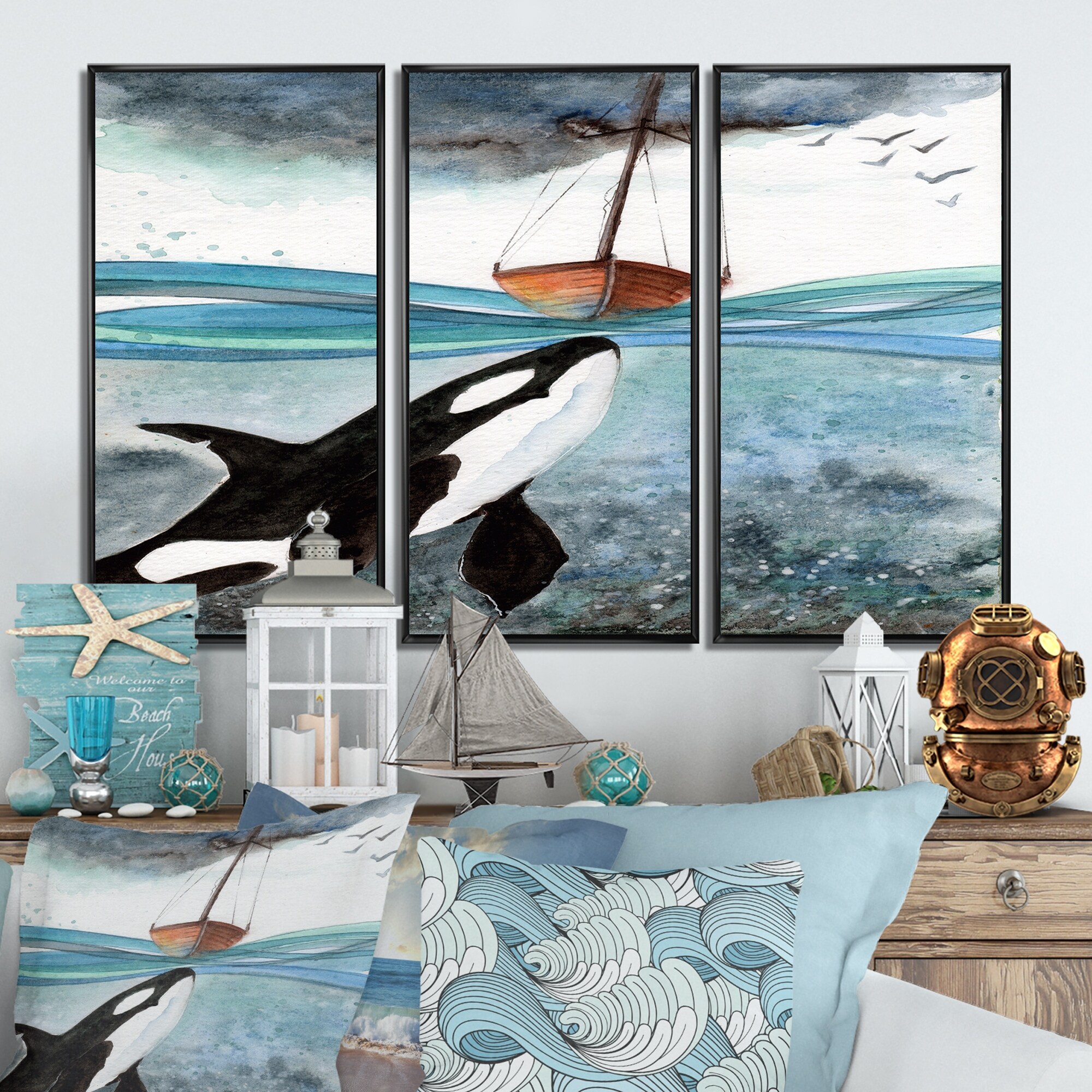 Designart "Orca In the Blue Sea" Nautical & Coastal Framed Artwork Set of 3 - 4 Colors of Frames