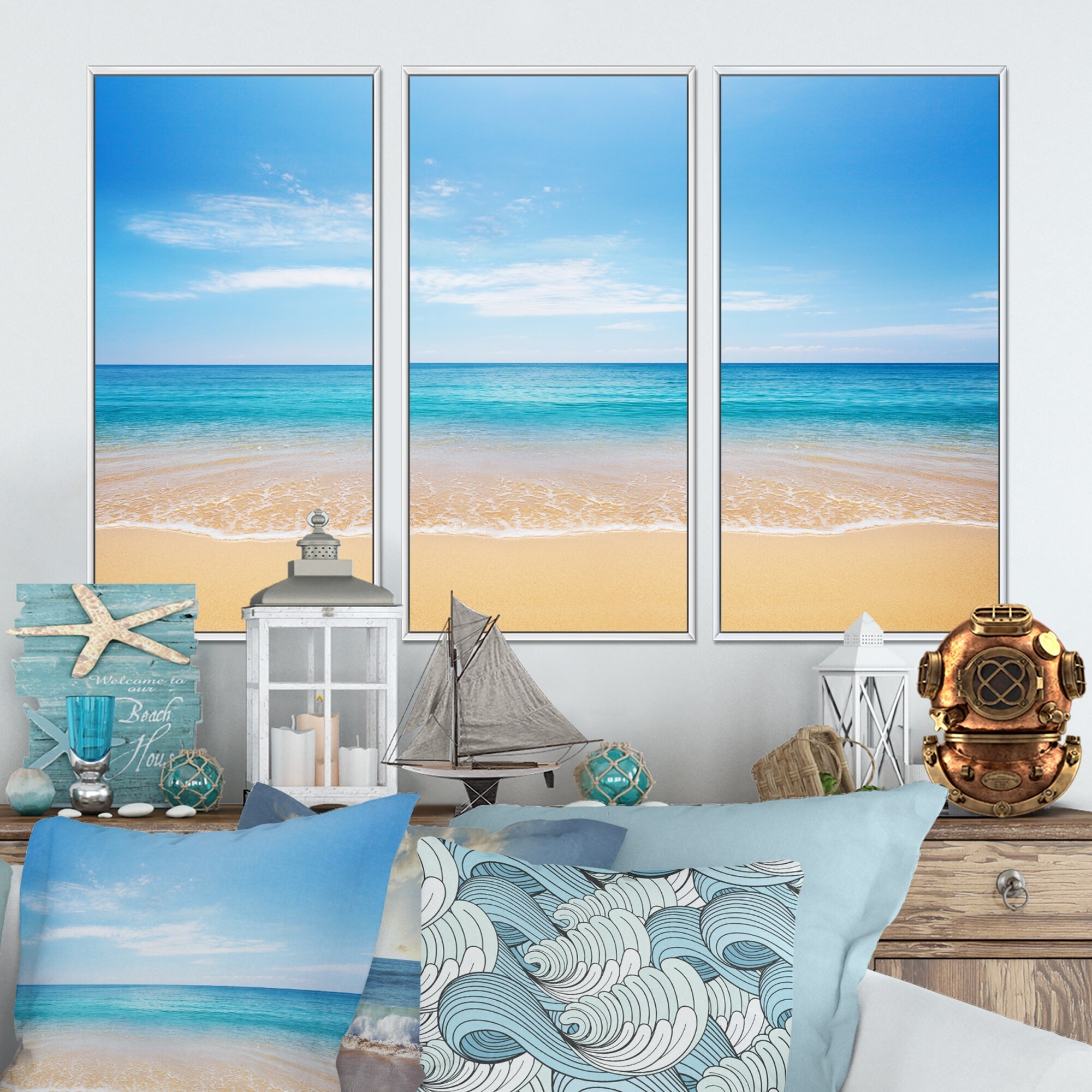 Designart "Blue Sea and Sky with Sandy Beach" Sea & Shore Framed Art Set of 3 - 4 Colors of Frames