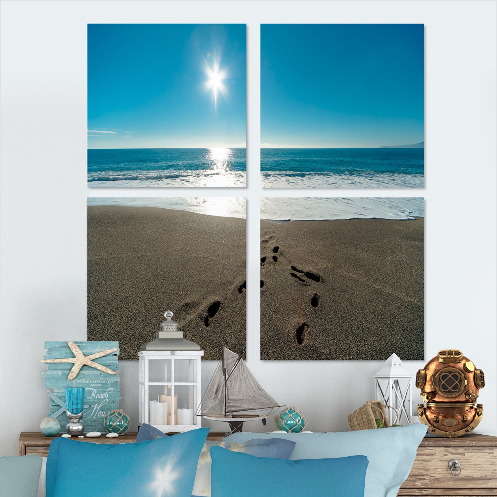 Blue Sea and Footprints in Sand - Large Seascape Art Canvas Print