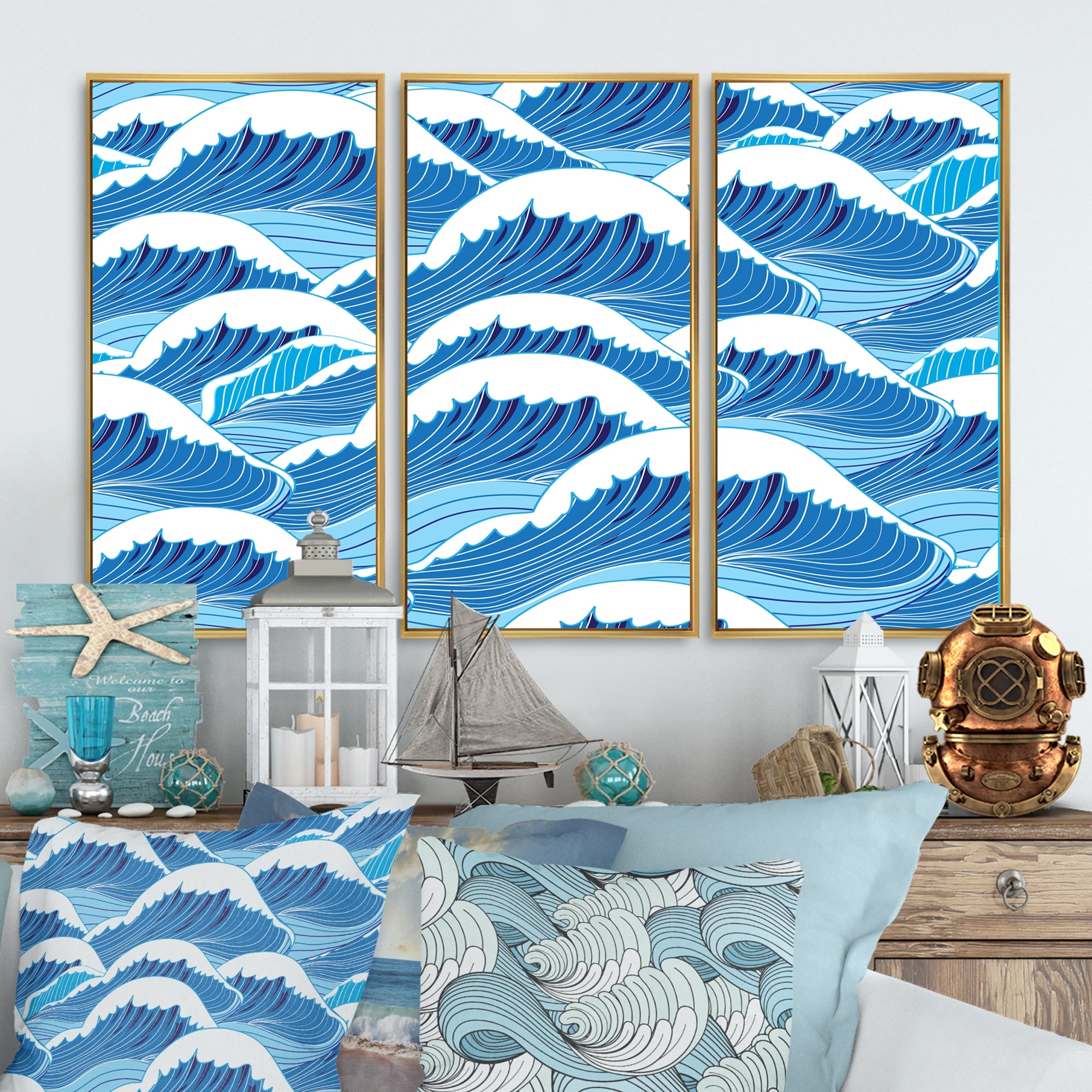 Designart "Abstract Light Blue Sea Waves" Nautical & Coastal Framed Wall Art Set of 3 - 4 Colors of Frames