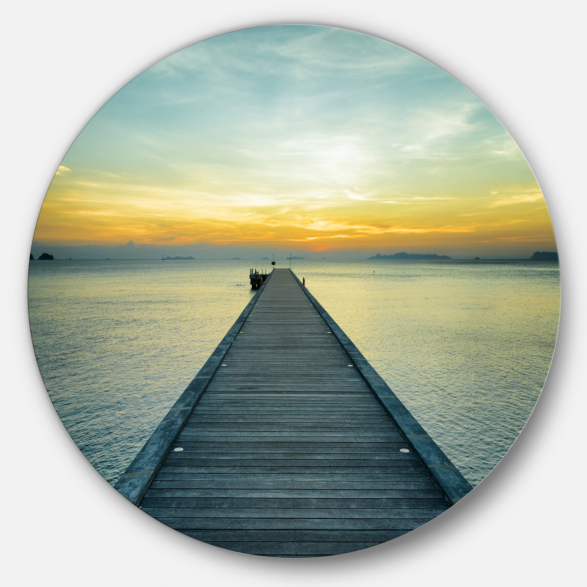 Designart 'Wood Pier into the Yellow Blue Sea' Wooden Sea Bridge Circle Wall Art